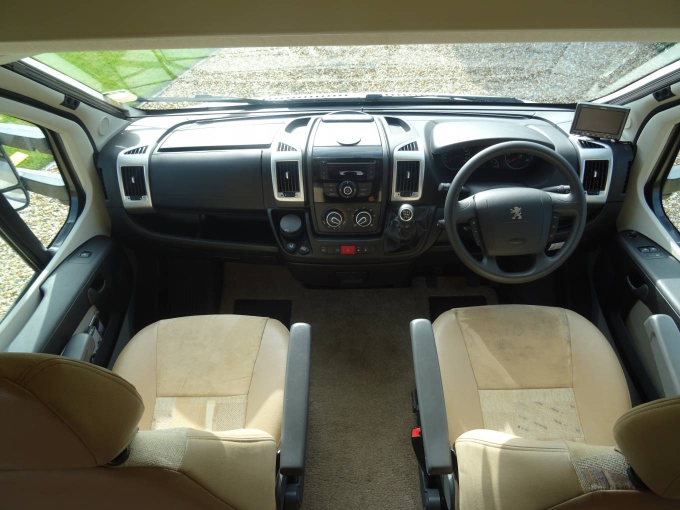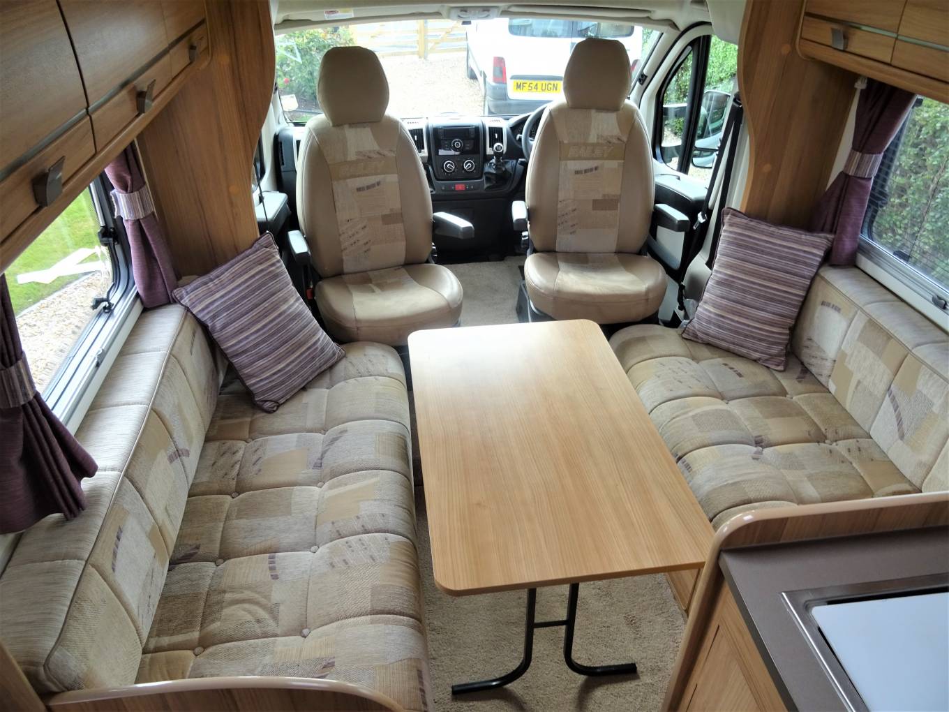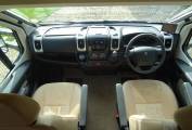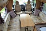 As we enter the front of the motorhome, there are 2 swivel seats that can face the central lounge area/TV. In the cab there is air con and a large reversing camera which is fixed to the dashboard.