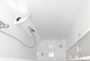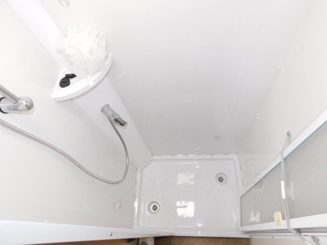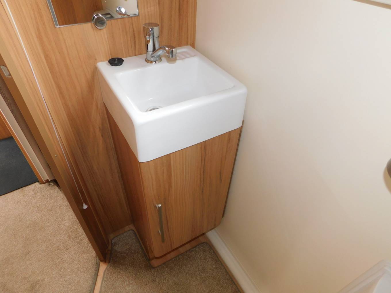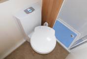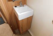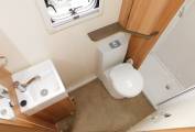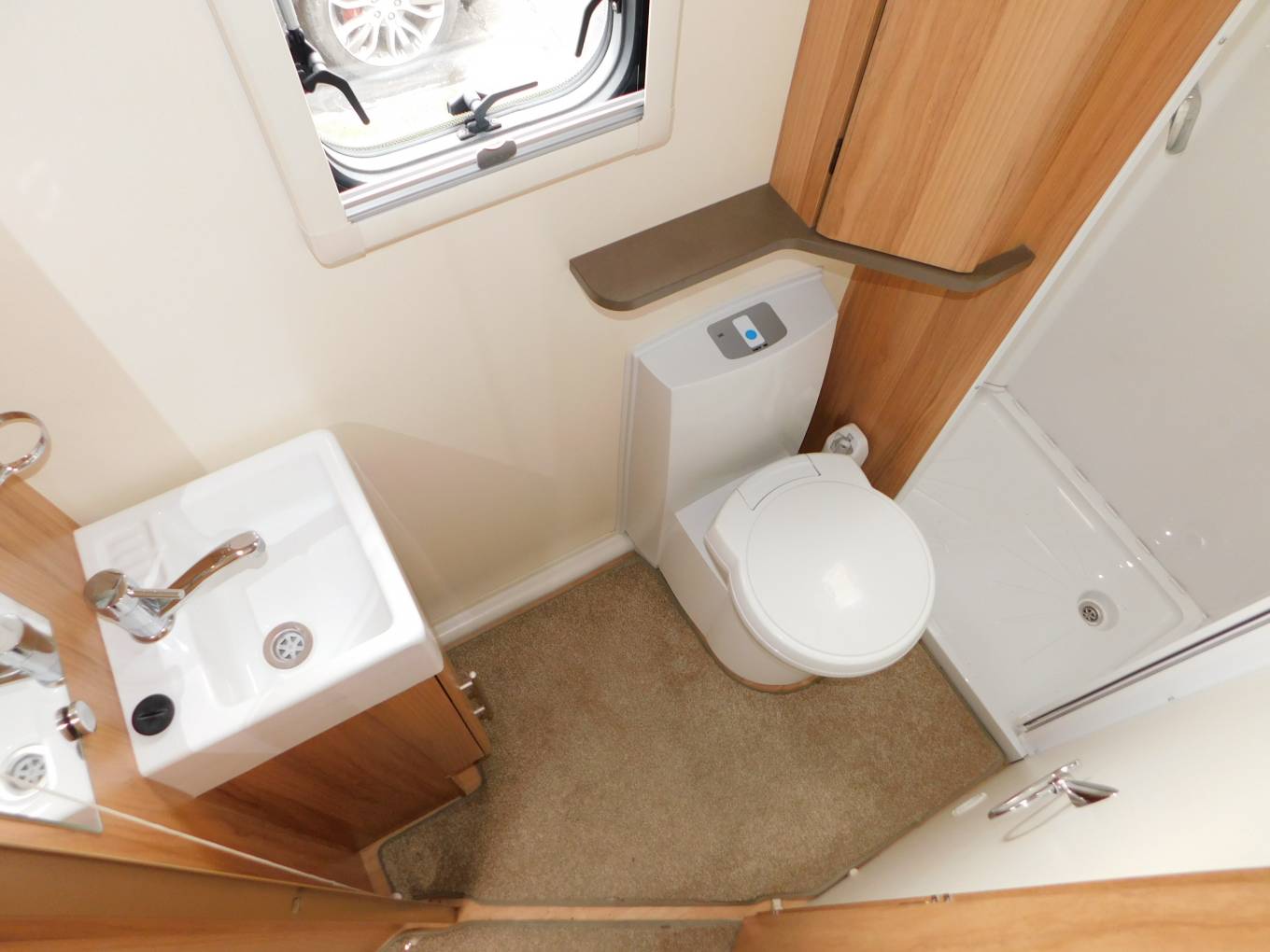The washroom is surprisingly large with a separate shower cubicle with Perspex shower door, a Thetford cassette swivelling toilet with electric flush and a designer wash basin with chrome mixer tap.