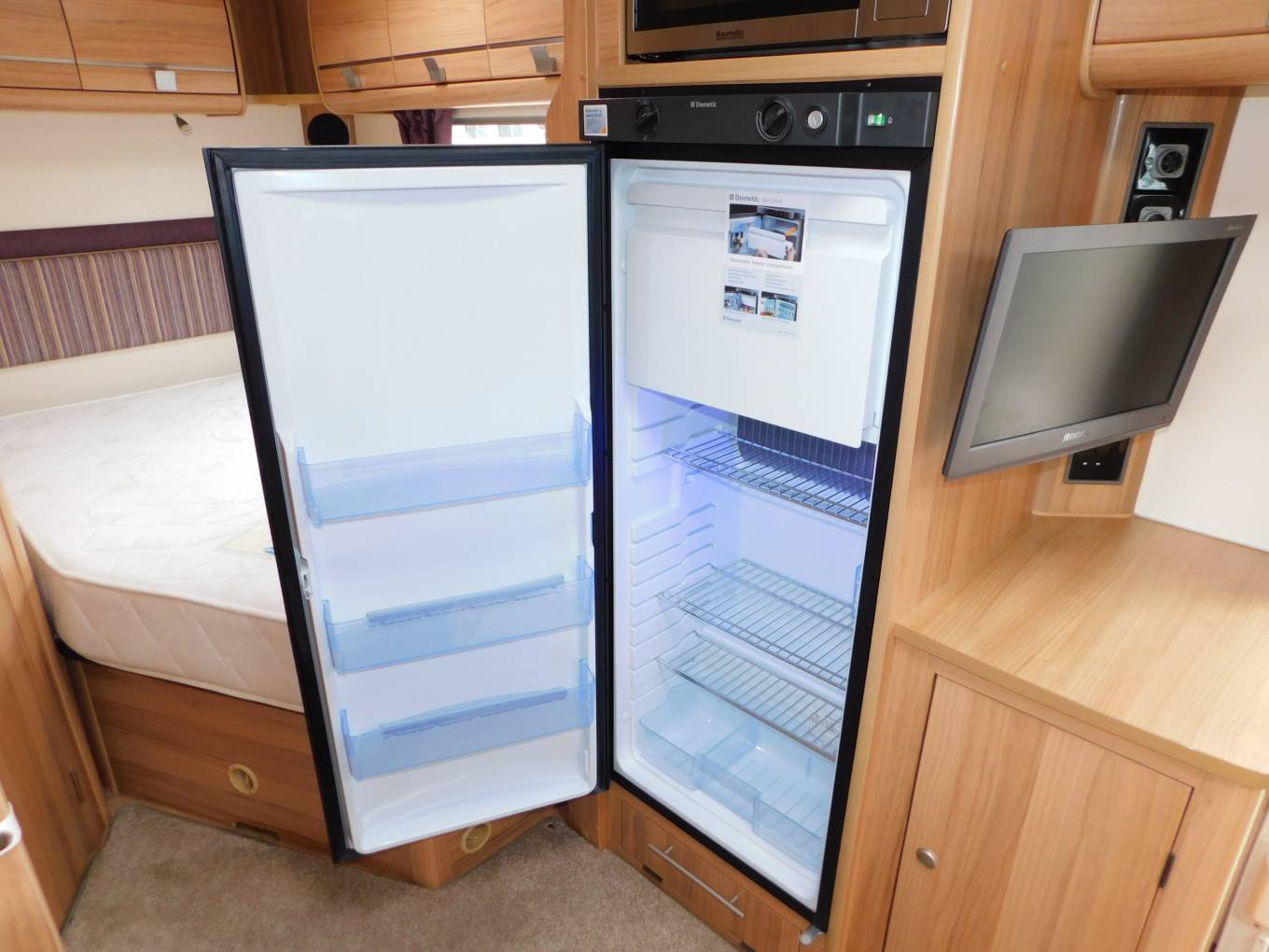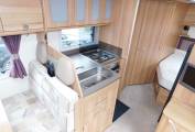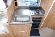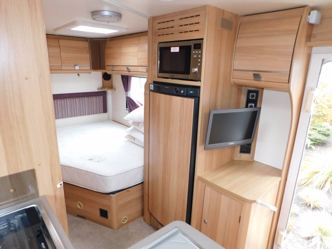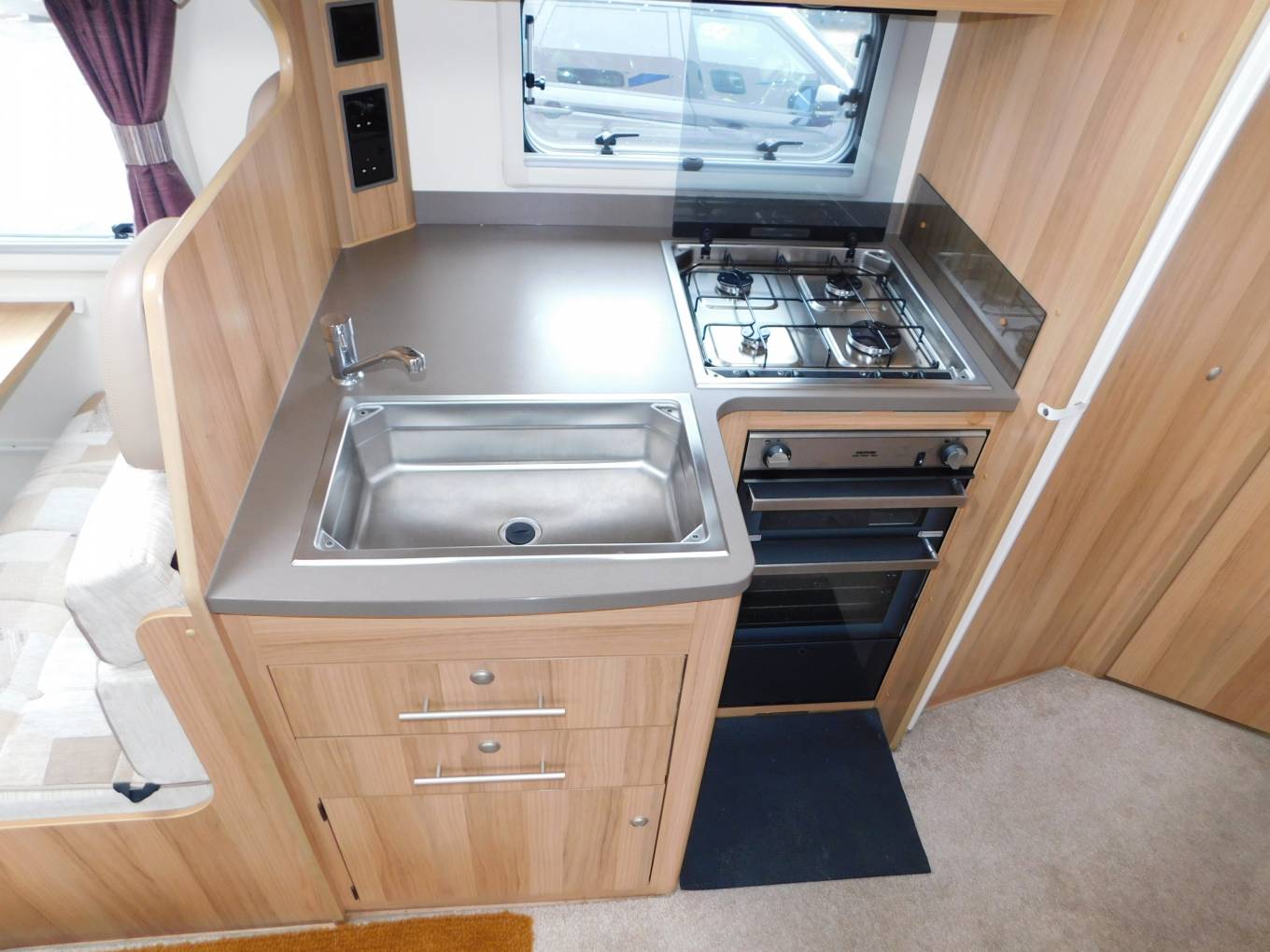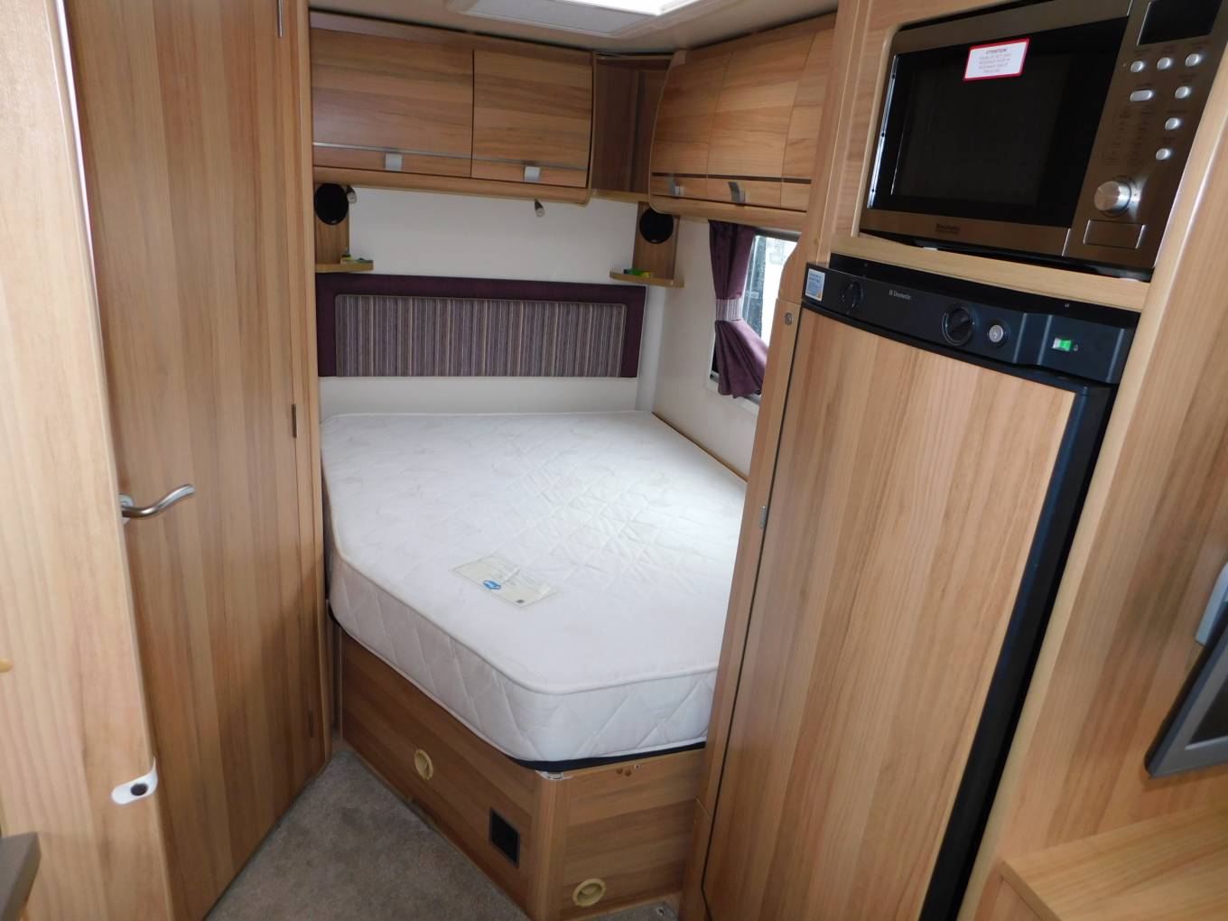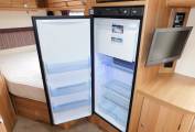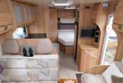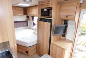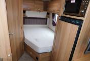 The main feature is the fixed French double bed, which raises on gas struts to reveal a large storage area that can be accessed via an external locker door, more storage cabinets above and a large wardrobe with hanging rail. This area does section off at night time with a sliding privacy door.