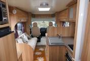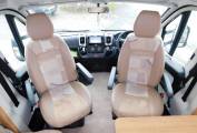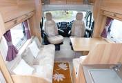 Step inside and you heave the lounge and dining area to your left, with a side sofa and two forward facing seats that have 3 point seat belts fitted, a large dining table and the two front seats swivel to face the table. This area converts to a large double bed in the evening. Upper aircraft style lockers and under seat storage available, plus additional over cab storage lockers.