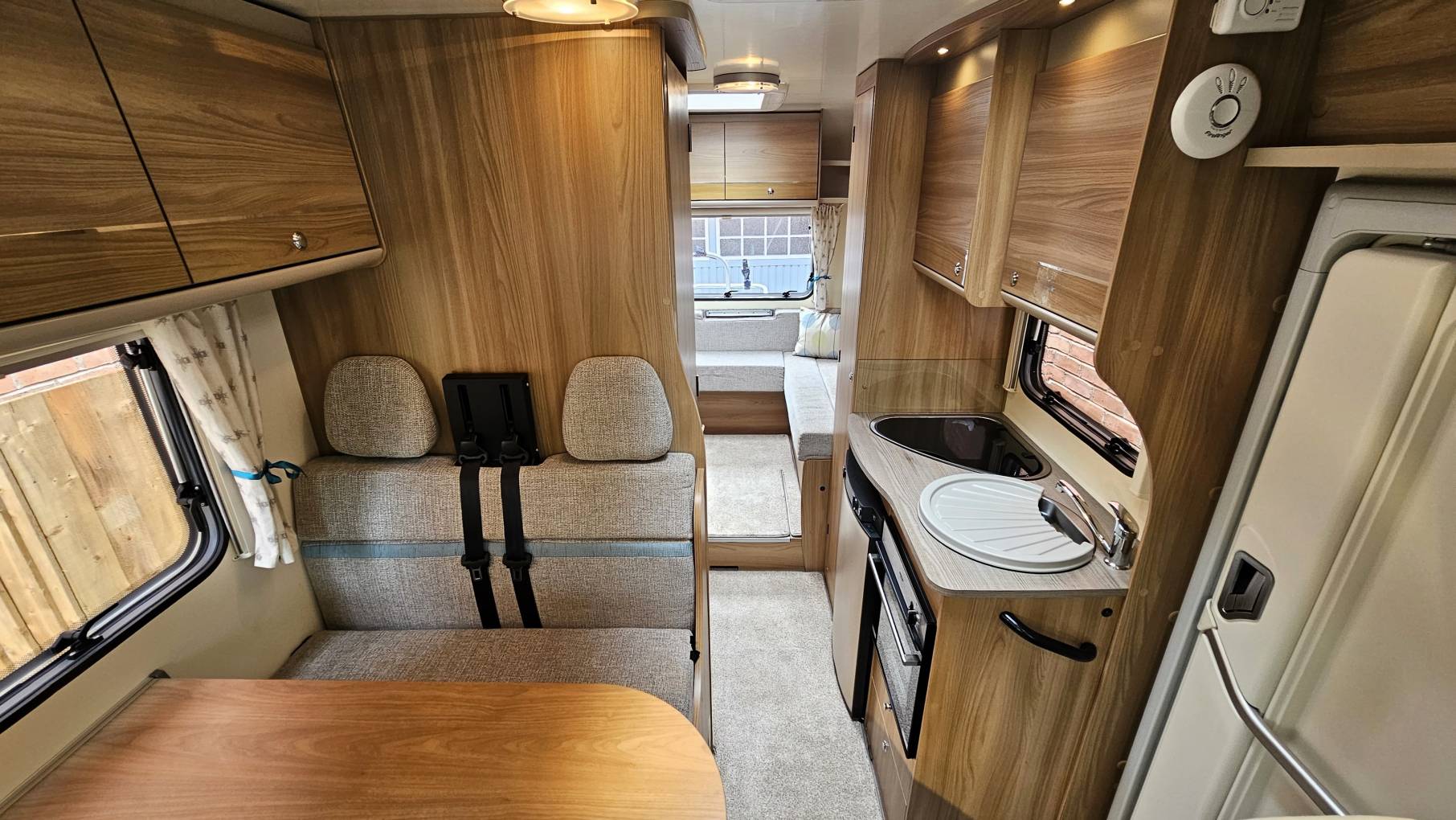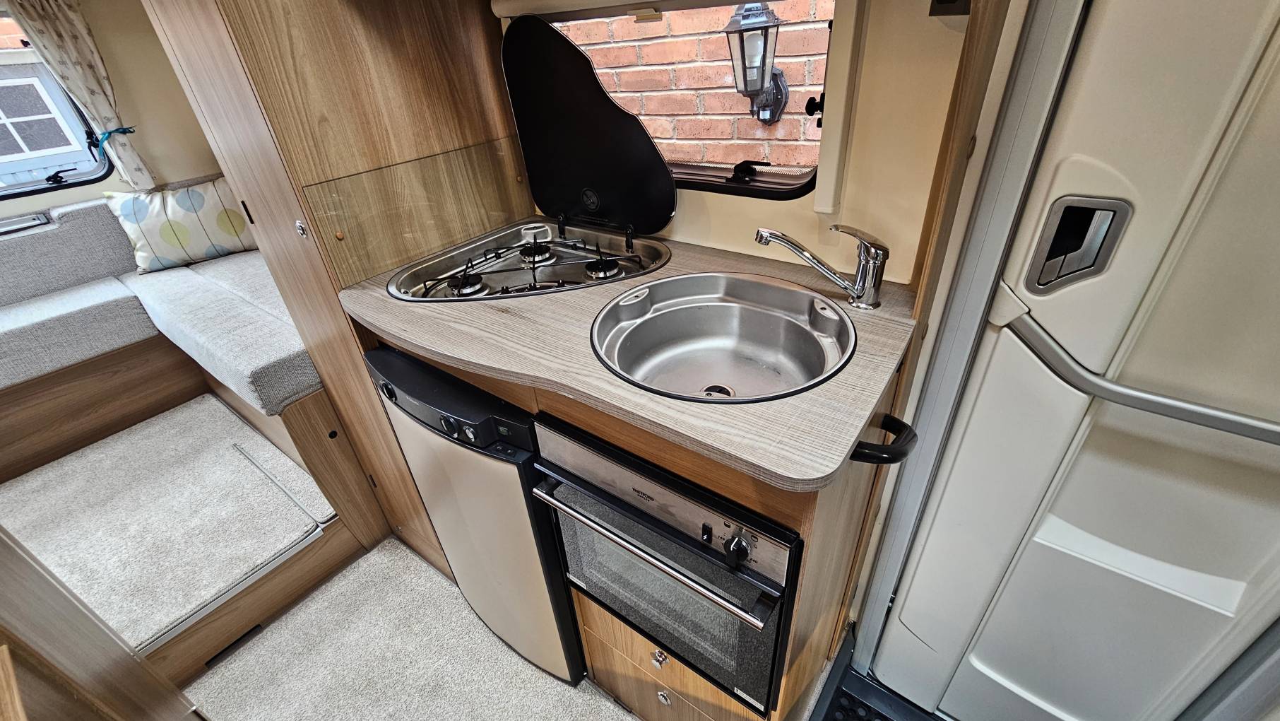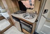 plenty of natural light and here you will find the kitchen with all the modern appliances you need for your travels; fridge with freezer space, x3 gas hobs, combi oven and grill,