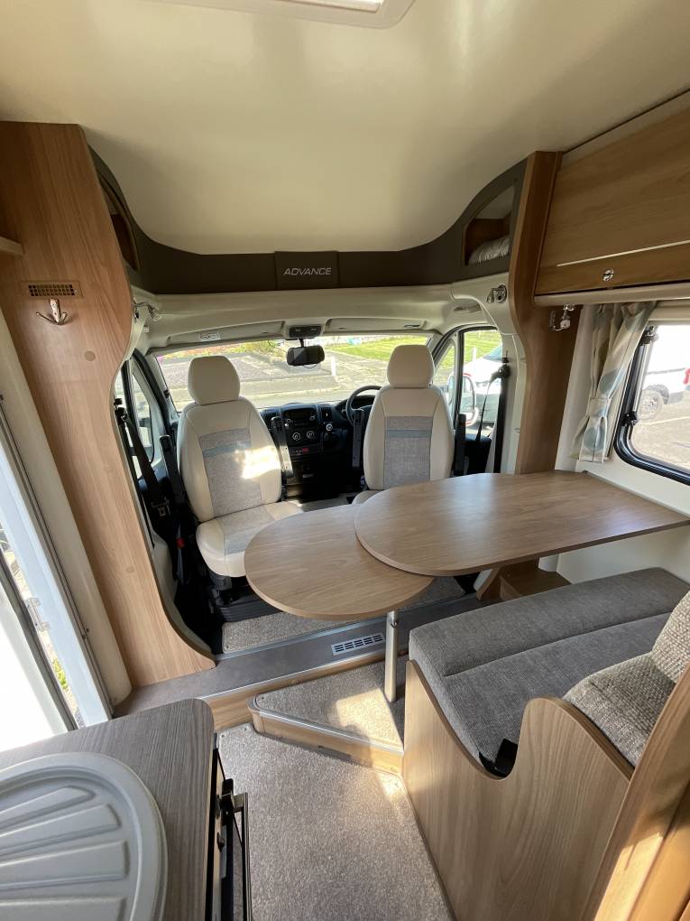 Just behind the cab seats you have the centre dinette which not only provides a space to relax and eat but also provides 2 extra travelling front facing seat belts, this area is again in great condition. Both front seats swivel around and the table extends to easily accommodate up to 4 people, this can be transformed into the 3rd bed.
