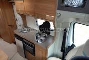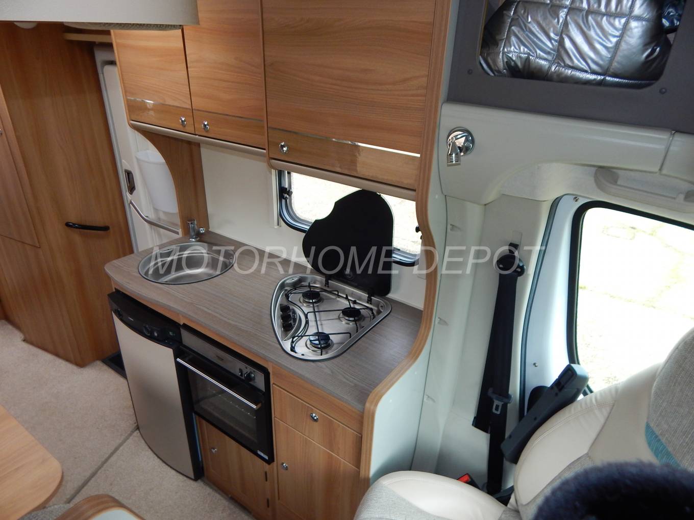 The mid-kitchen has a round stainless steel sink with chrome mixer tap and a loose fit draining board, a 3 burner gas hob with glass lid, a combination gas grill and oven beneath. A Thetford three-way powered fridge with removable freezer box (to give more fridge space), plus upper storage lockers and lower cabinets to store-away all of your holiday provisions. There is a cupboard above the hob that has the provision and a 230v socket to fit a microwave oven.
