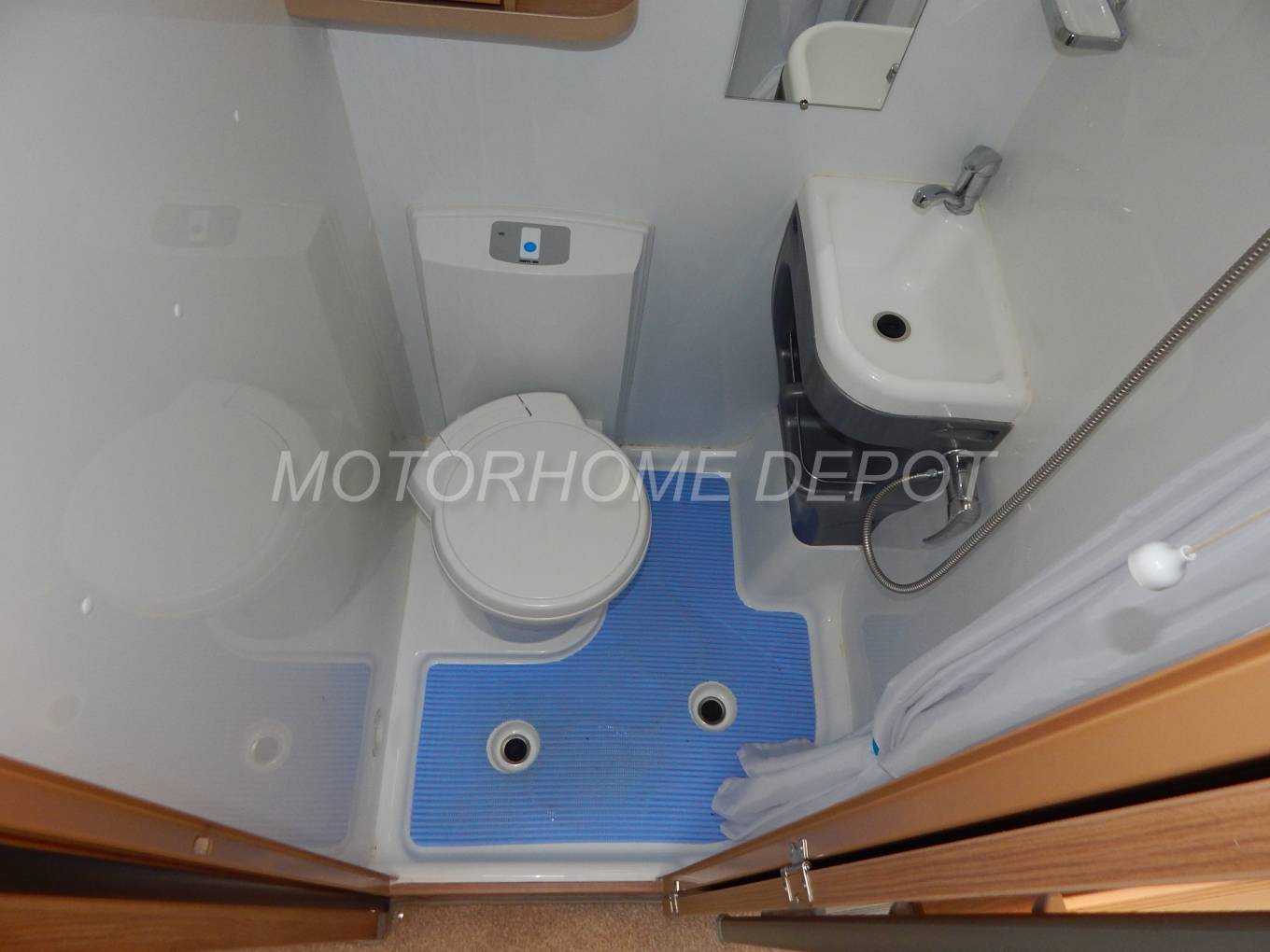 - The washroom is quite spacious for a six berth motorhome, a wall mounted wash-basin with chrome mixer tap, a Thetford cassette swivelling toilet with electric flush, a separate tap supplying the shower handset, plus a shower curtain. A wall mounted cabinet is located above the toilet.