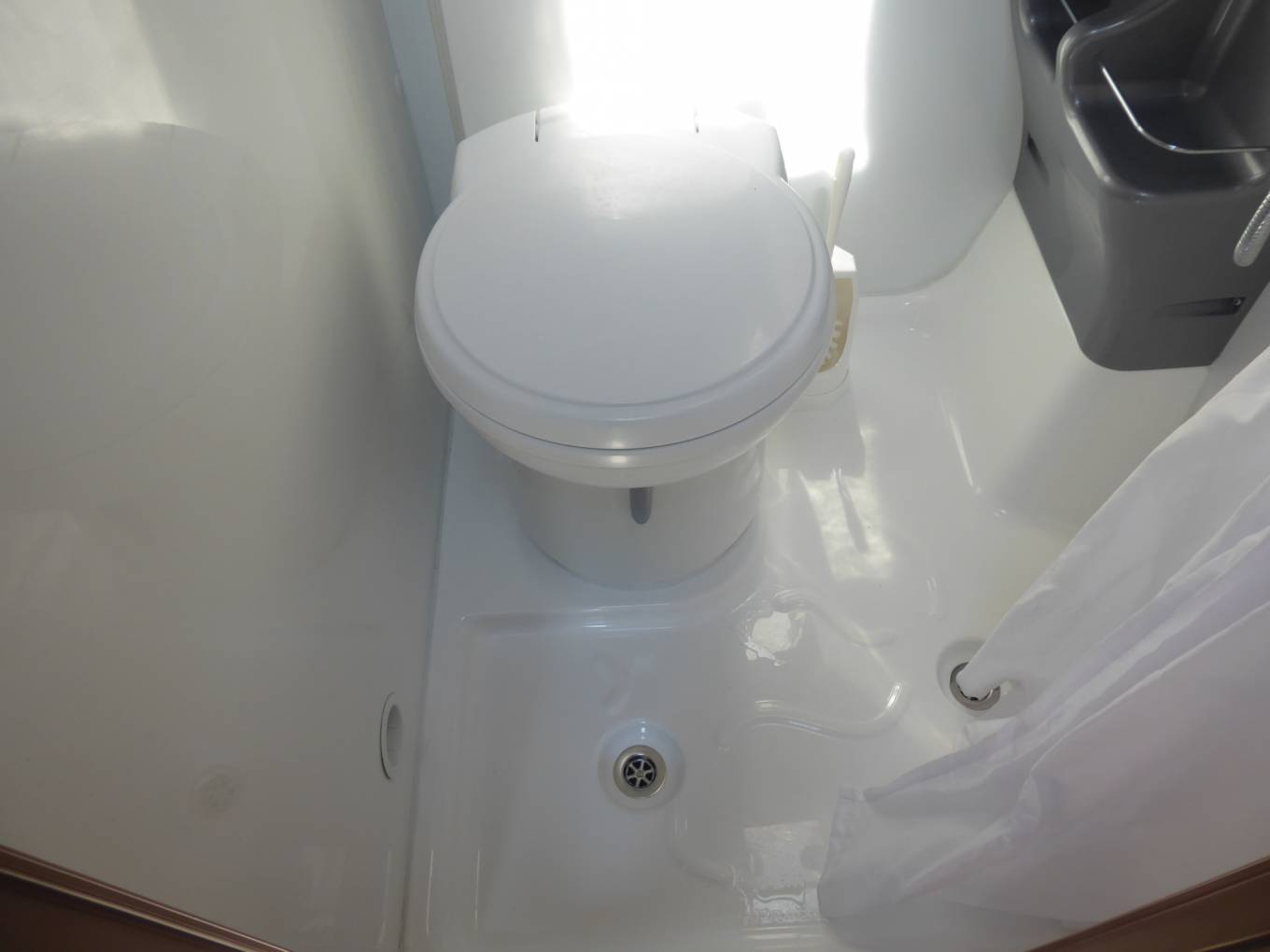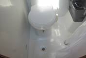 Behind the dinette is the wetroom which contains a toilet, a hand basin, and a shower.