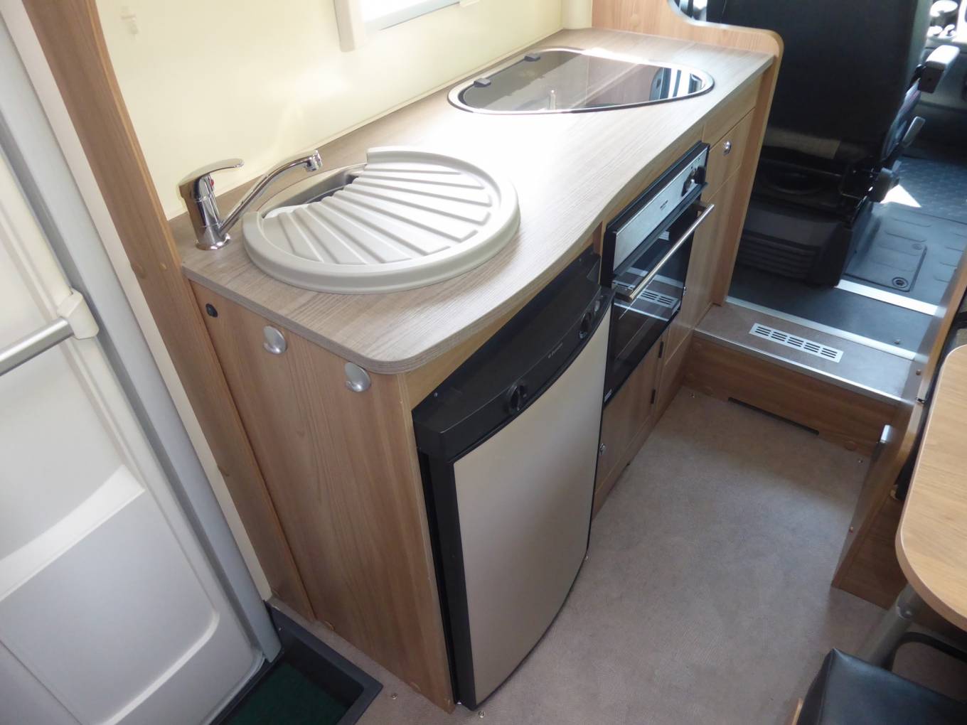 Opposite the dinette, conveniently adjacent for food storage and preparation, is the central kitchen, complete with a sink, an oven/ grill combination, a hob with 3 gas burners, and a fridge with a freezer box. There is an overhead cupboard with an electric socket ready for the installation of a microwave.