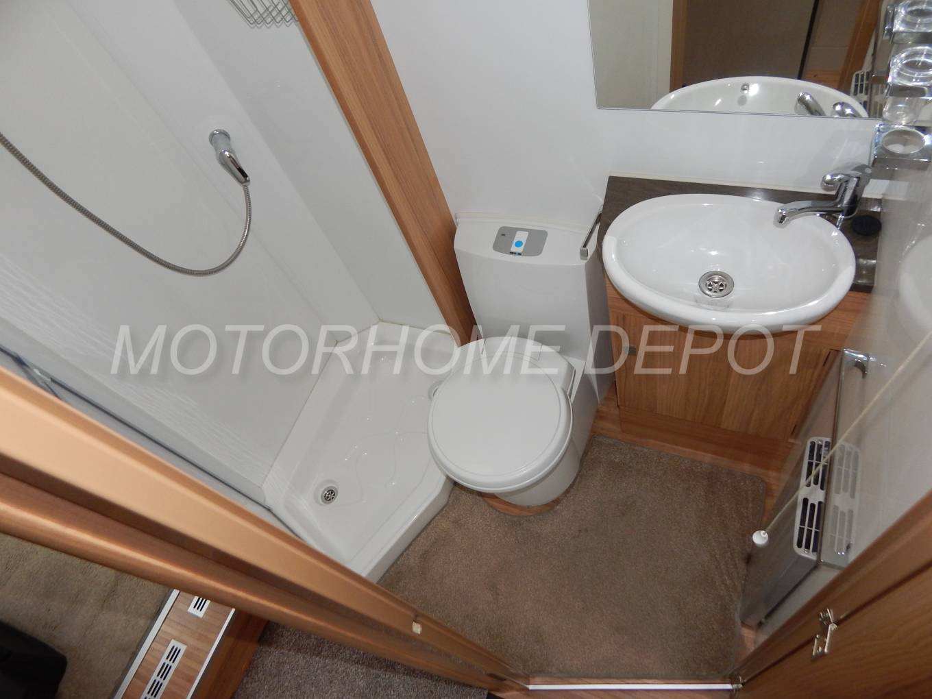 The washroom has a good sized separate shower cubicle with perspex folding shower doors and a rising rail with shower handset, a Thetford cassette swivelling toilet with electric flush, a washbasin with chrome mixer tap and storage cupboard below, large mirror above.