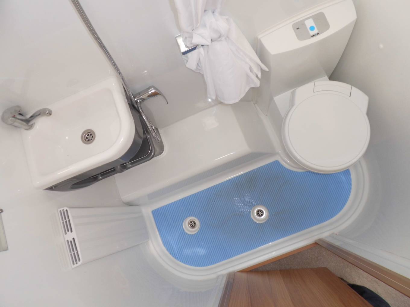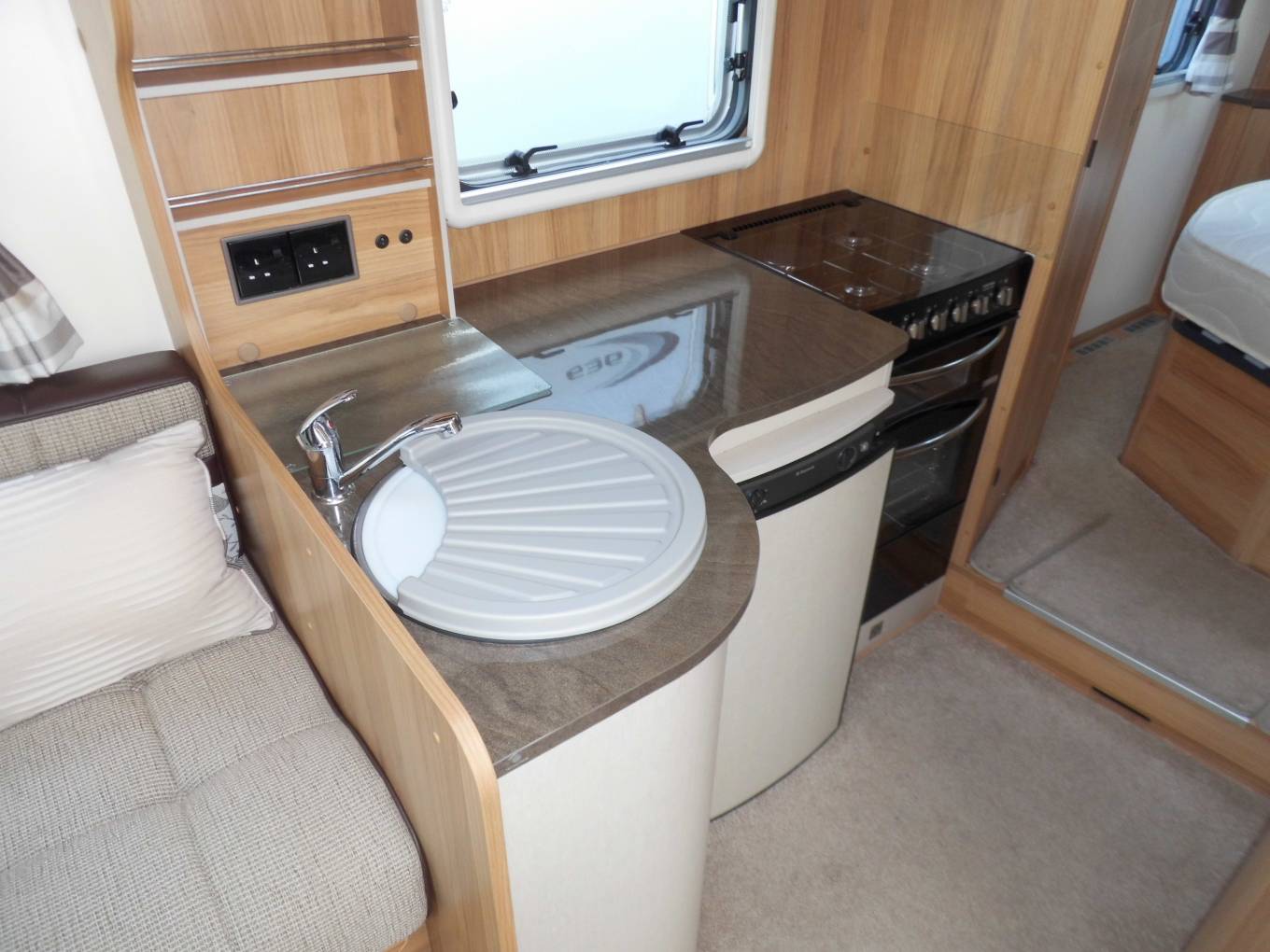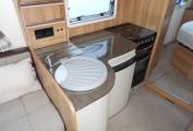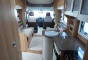 As you exit the bedroom the bathroom is on your left and the kitchen is on the right. The bathroom has a shower, a cassette toilet, a wash basin with mixer tap, a vanity unit and a mirror. A slightly unusual feature of the bathroom is that it has both a window and a skylight so it isn't dark and dingy like some motorhome bathrooms. The kitchen is really well equipped so there's no excuse for not being able to rustle up a gastronomic meal. There is an oven with grill, a microwave, a dual-fuel hob with 3 gas burners and 1 electric hotplate, a 110 litre 3 way fridge freezer, a stainless steel sink with mixer tap and a generous work top area for food preparation.