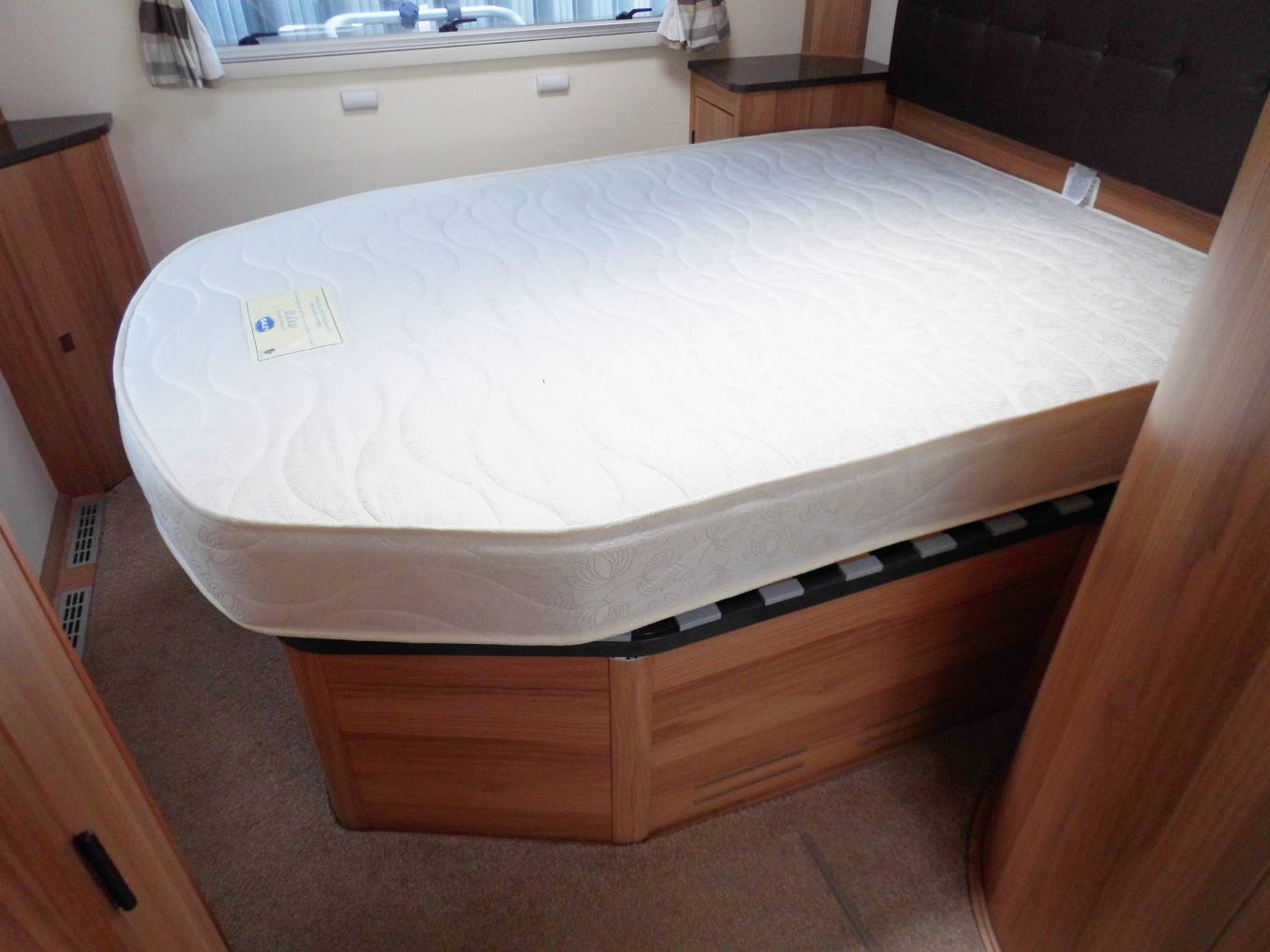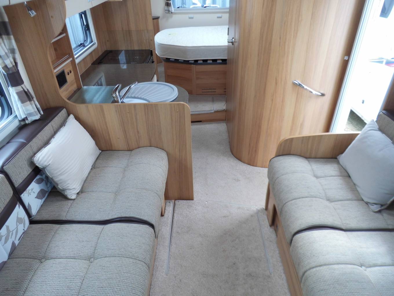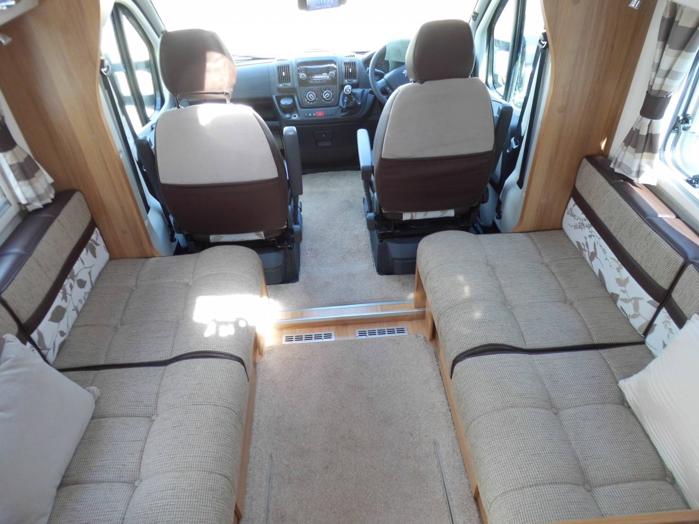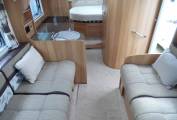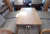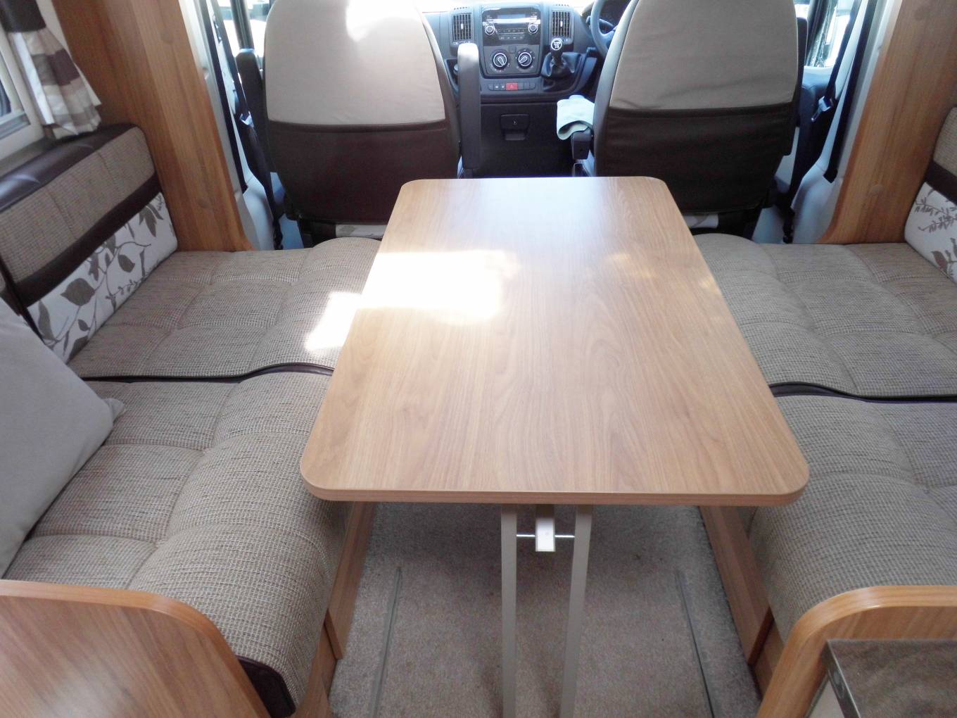 The lounge area has a skylight and large windows and is a bright and airy place to relax in. It has 2 side facing sofas which are finished in a stylish grey fabric. There is a freestanding dining table that can be stored away when not in use and as both front seats swivel 4 people can dine in comfort.