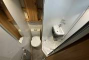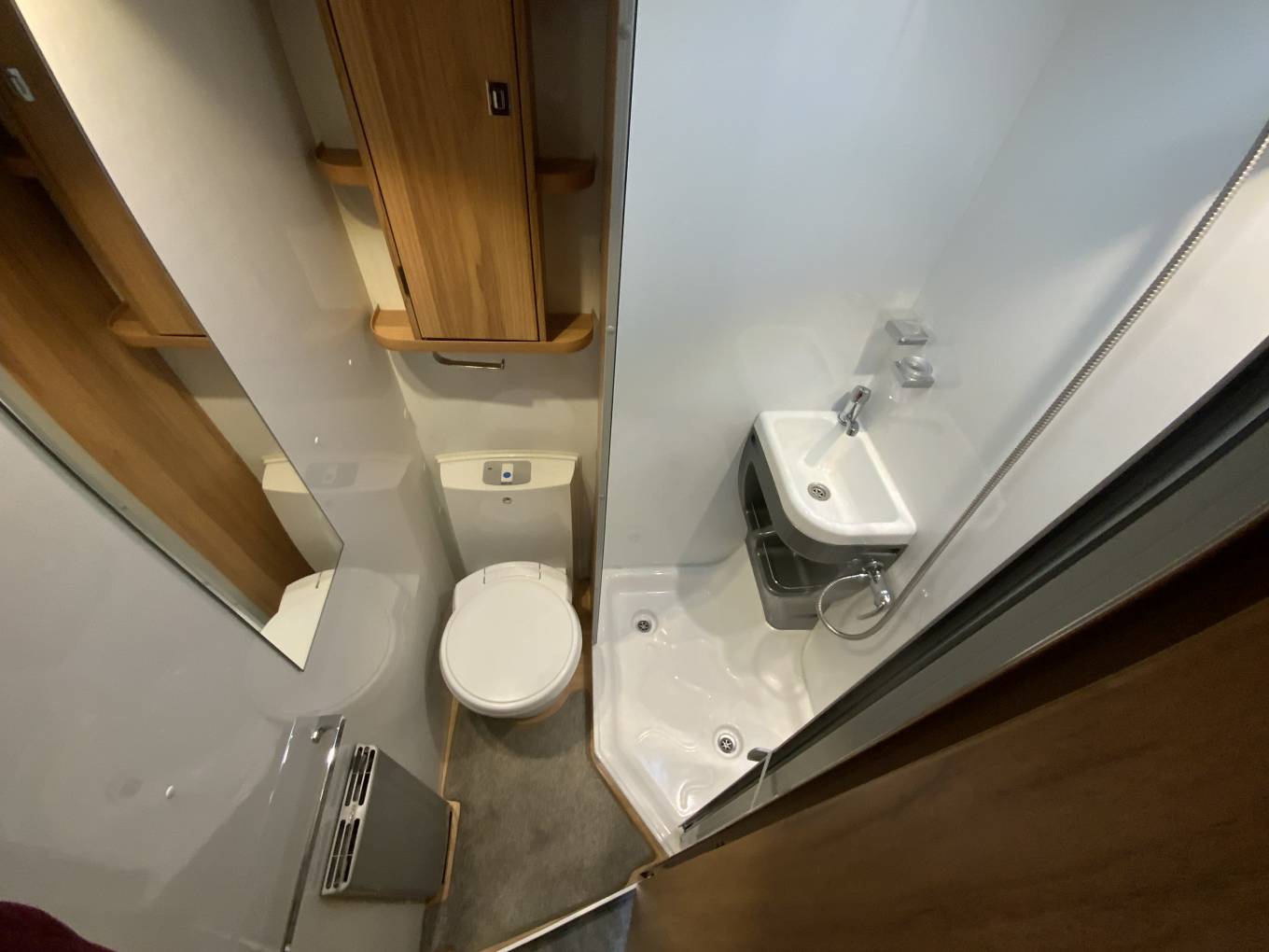 The well appointed central washroom doesn’t take up too much space as the washroom tapers towards the rear of the vehicle, so that the central corridor widens slightly as it approaches the rear lounge.The wider, front-most portion of the washroom is dedicated to the Thetford toilet, while the narrower rear section houses a separate shower cubicle which is includes the washbasin which a clever space-saving solution.