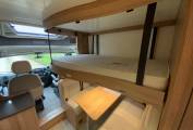 The superb electric drop-down bed is postioned longitudinally and not transverse across the width of the habitation space, taking up only half of the vehicle’s width, thanks to the Bailey 765 wide habitation body a corridor is retained through the motorhome, even when the bed is lowered. The bed is lowered electrically, controlled by a dedicated switch near the control panel, there’s a safety cut-off in the form of a key, to ensure that the bed never lowers by accident. It’s a spacious and very comfortable double bed, equipped with excellent Froli plastic bed springs, accessible via a ladder, since it lowers about halfway down the height of the interior in order to retain sufficient headroom for the dinette bed underneath it, which is easy to make up and a good sized double bed.