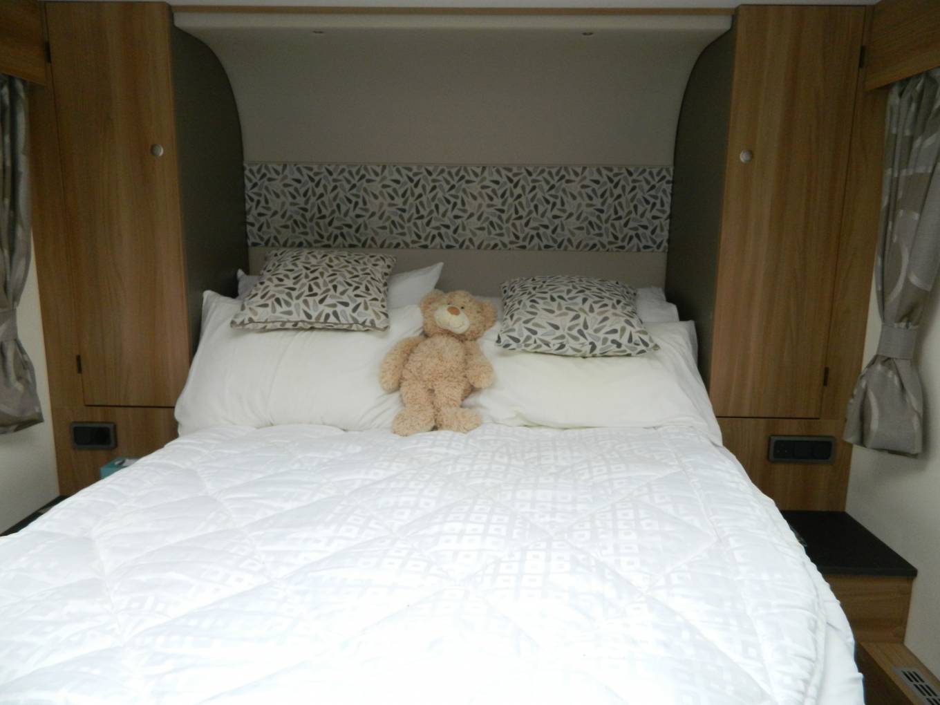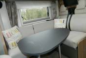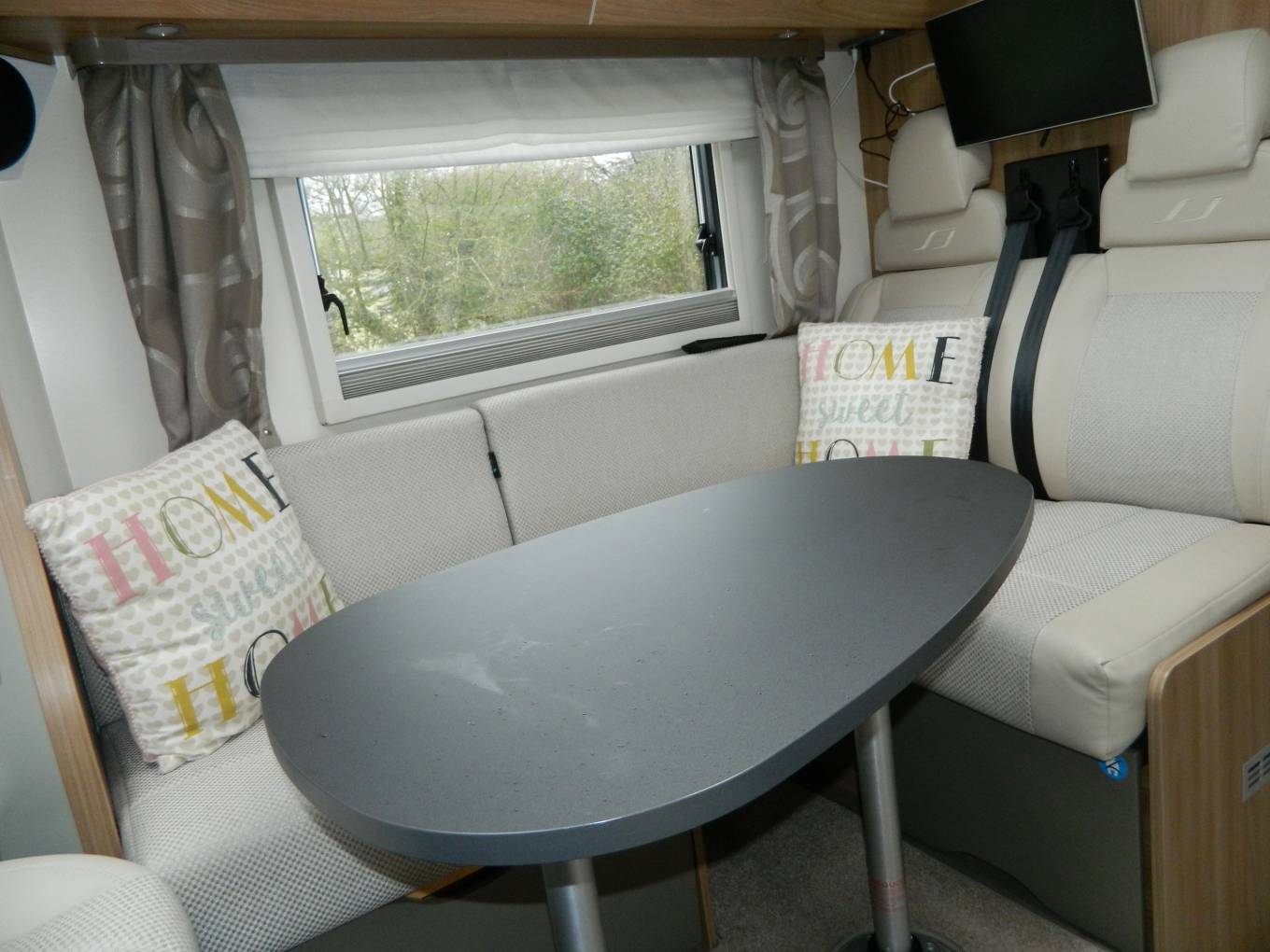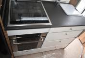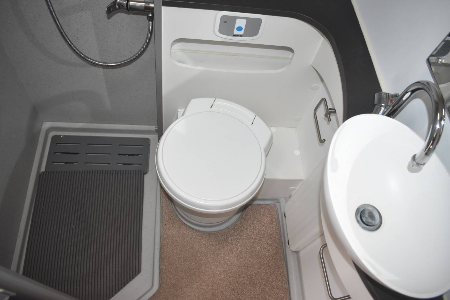 As you step into the habitation area, the lounge/dining area has an L-shaped sofa and a single seat opposite. With the two Captain’s chairs swivelled into the area, there is plenty of room for six to dine in comfort. There is also a WiFi point and TV in the lounge area. In the centre of the motorhome, you have the very well-appointed kitchen area complete with 3-burner gas hob with one electric plate, oven/grill, stainless steel sink with mixer tap, large 3-way fridge/freezer and a microwave. There is good work-top space for prep work and plenty of storage in the drawers and a large cupboard above. On the opposite side you have the washroom complete with separate shower unit with bi-fold door, Thetford cassette toilet with electric flush, washbasin with mixer tap and a storage cupboard. The bedroom with sliding privacy door at the rear is a lovely space with a large double island bed with easy access on both sides, large underbed drawers, a wardrobe either side of the bed and a couple of lockers. The dual fuel programmable Alde system provides heating to the radiators and hot water and there are removeable carpets fitted throughout, flyscreens and blinds on all windows and a sliding flyscreen on the habitation door.