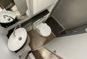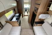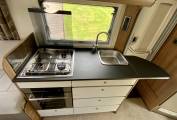 Firstly, we start at the rear lounge which has ample space for 2 to relax, dine and take in the surrounding views. When the night draws in the rear lounge converts to a spacious double bed. As we walk forward through this bright and airy Motorhome we arrive at the well equipped kitchen. The kitchen includes a large 3 way fridge freezer, electric and gas hob, oven, grill, microwave and wash basin. Opposite is a good sized wash room complete with shower, toilet and wash basin. Finally, we are in the cab which is flooded with natural light via sky light and features 2 swivel seats.