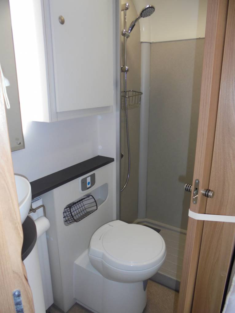 The washroom has a one-piece, fully sealed shower cubicle, an