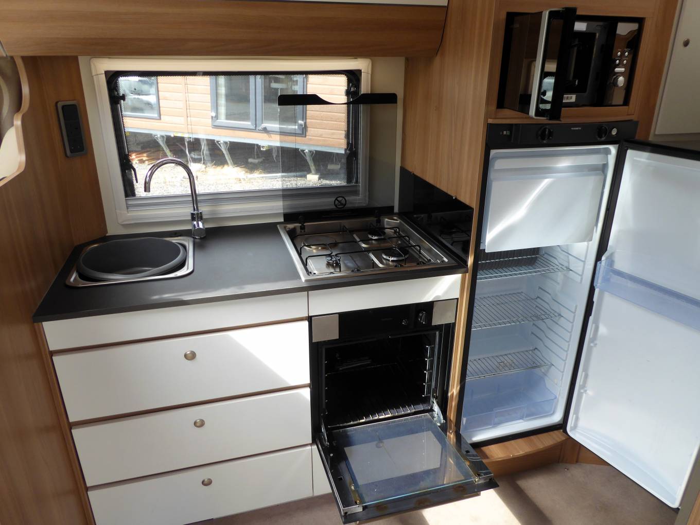 The kitchen has good amount of worktop space and includes cooker with oven, grill, 3 gas burners, 1 electric hob, plus sink, large fridge freezer and microwave. Above is the habitation air conditioning unit.