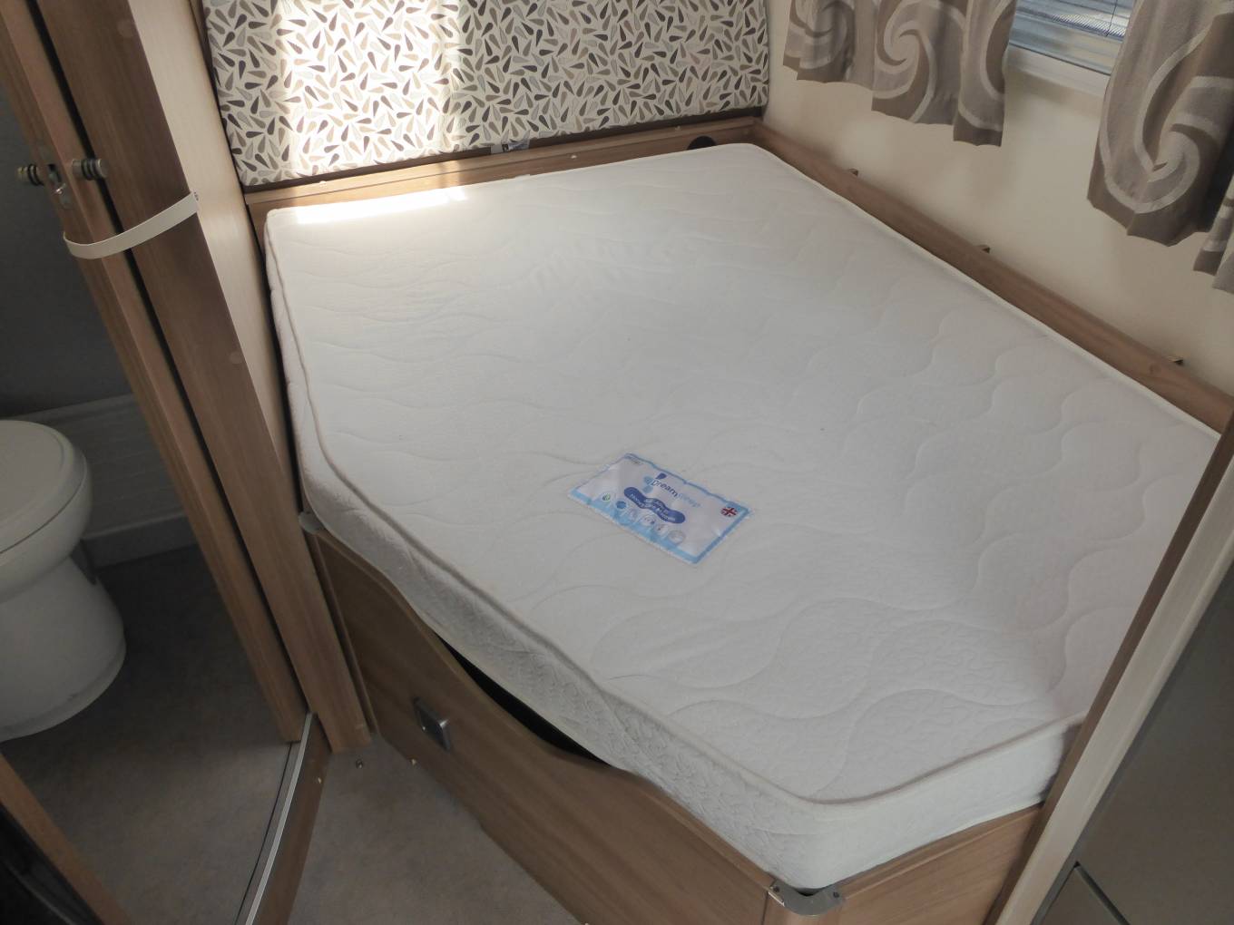Rear fixed, French bed, with additional storage below and surrounding. A TV is also here