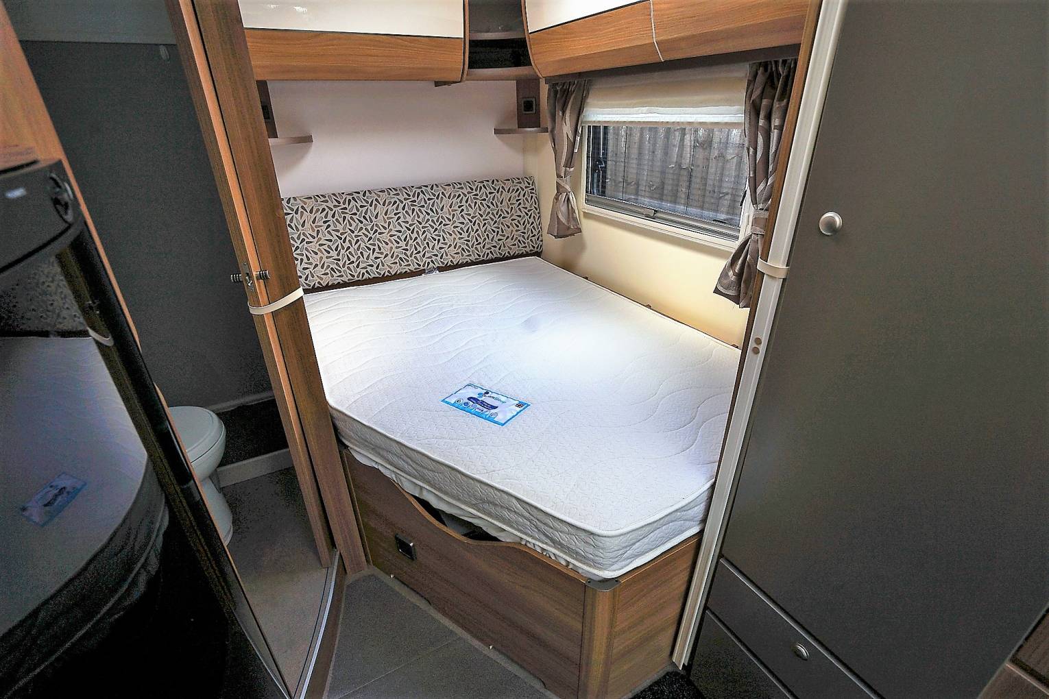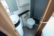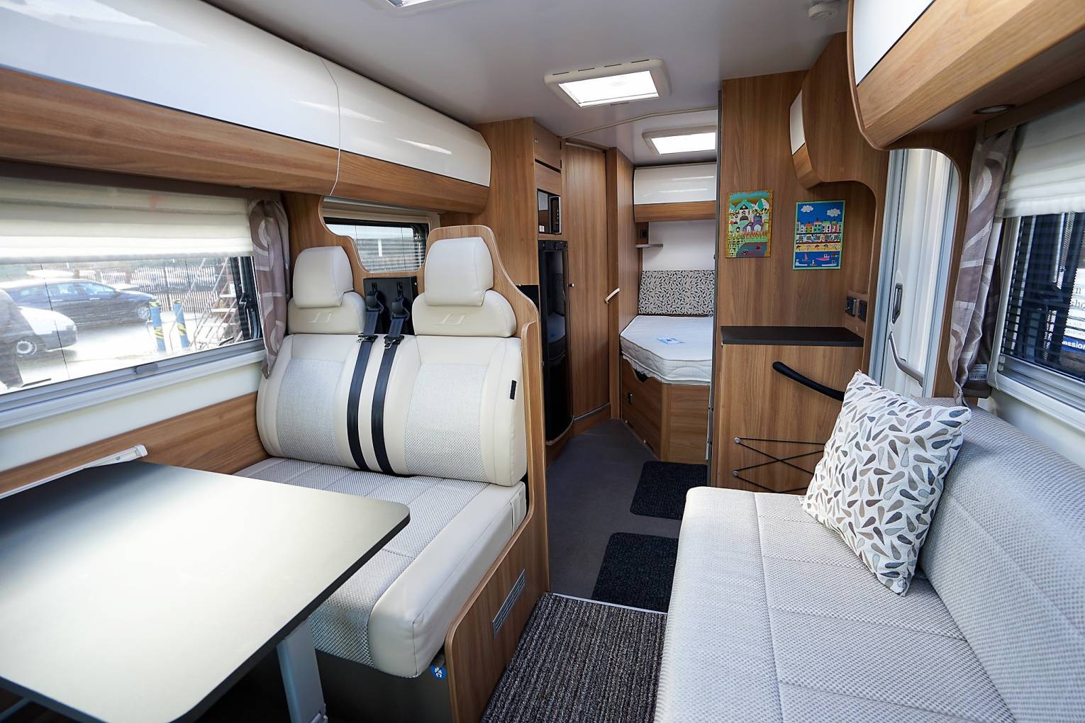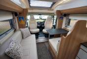 Satin finish soft-close drawers with push button handles in kitchen, ‘Aero Style’ overhead locker system with split level storage, Soft gas struts, Basalt stone’ finish kitchen and washroom worktop laminate. Fixed rear bed. Fibertek mattress lining giving you 2x thickness for extra comfort.