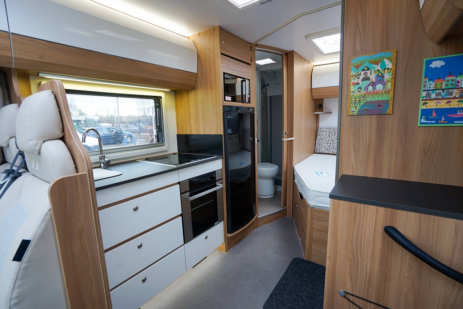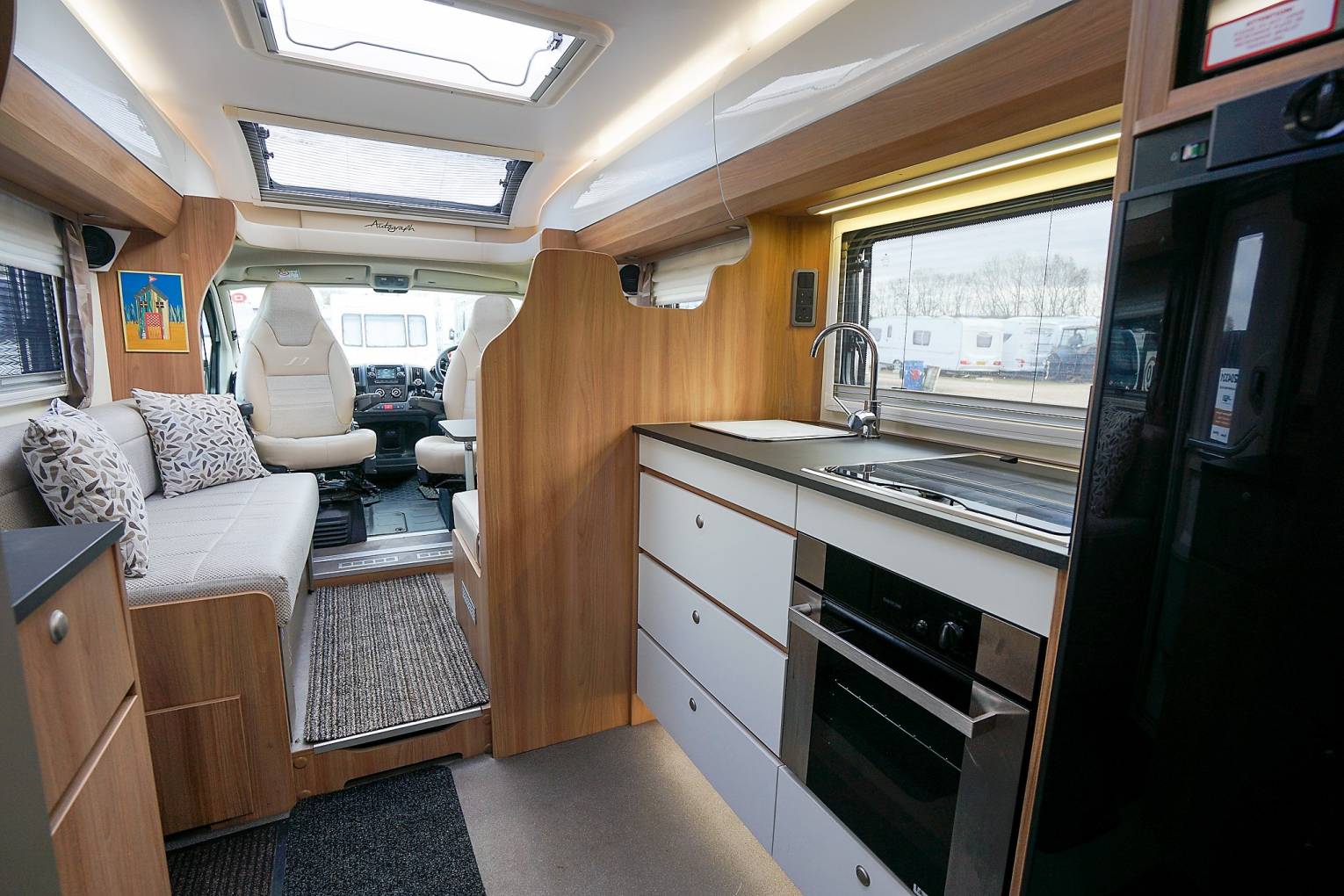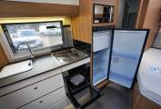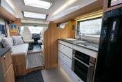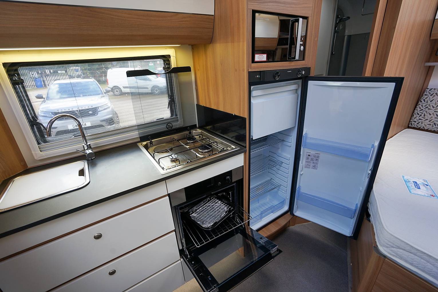 Dometic 145 litre tower refrigerator and detachable full width freezer compartment. Thetford Duplex XL combined oven and grill, Thetford dual-fuel hob with electric hotplate and 3 gas burners, Stainless steel 800 watt microwave.