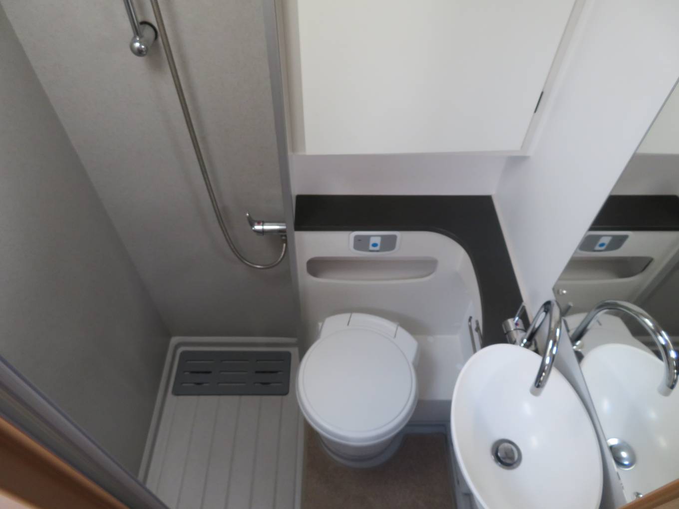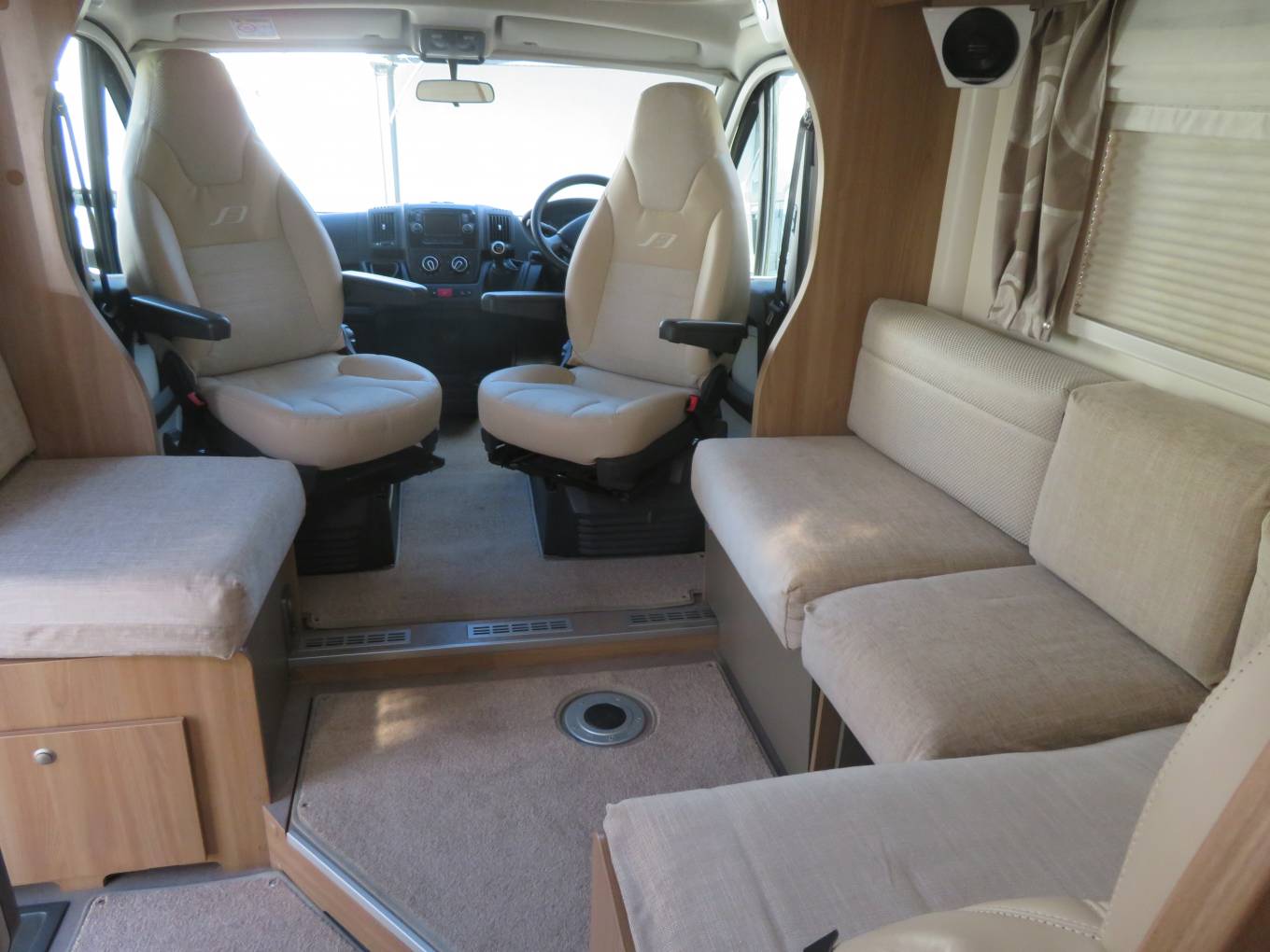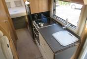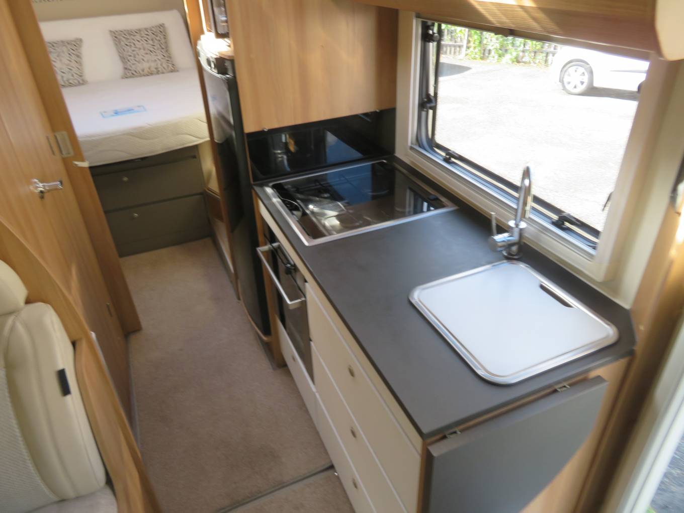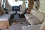 Up front the drive is easy and comfortable thanks to the latest 2 litre, 160bhp Peugeot Boxer engine, 6 speed gearbox and Al-Ko chassis. Other cab features include cab air conditioning, cruise control, reversing camera and integrated night blinds. Overall specification is very high, including Alde dual fuel central heating, roof mounted habitation air conditioning, roof mounted 100W solar panel, Gaslow refillable gas bottle, awning, Thatcham 1 alarm system and tracker under subscription