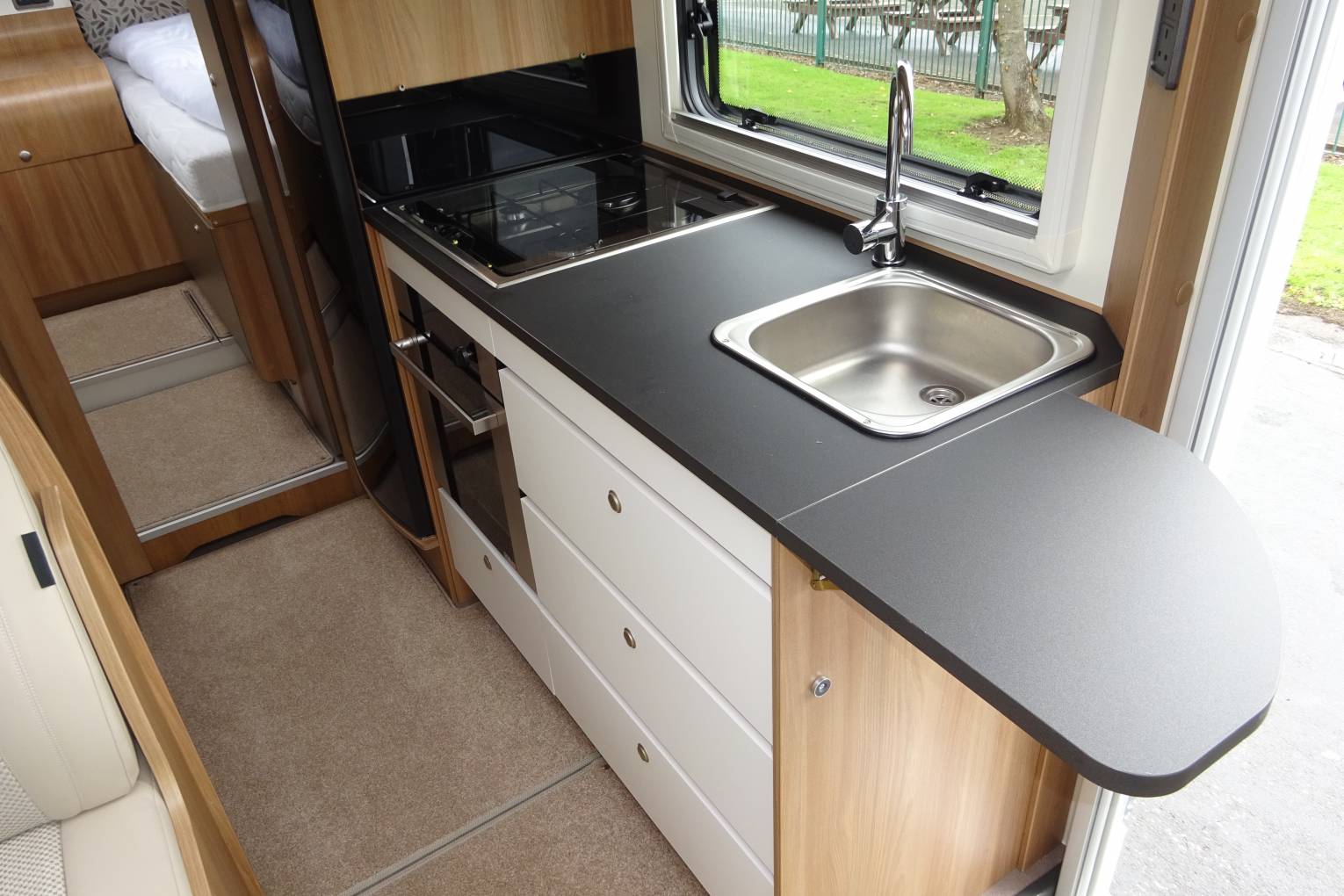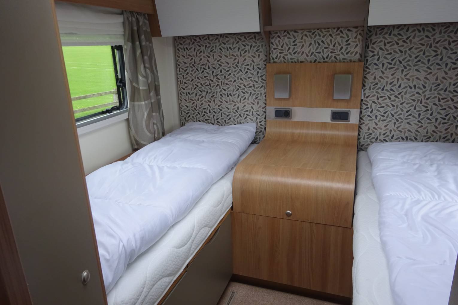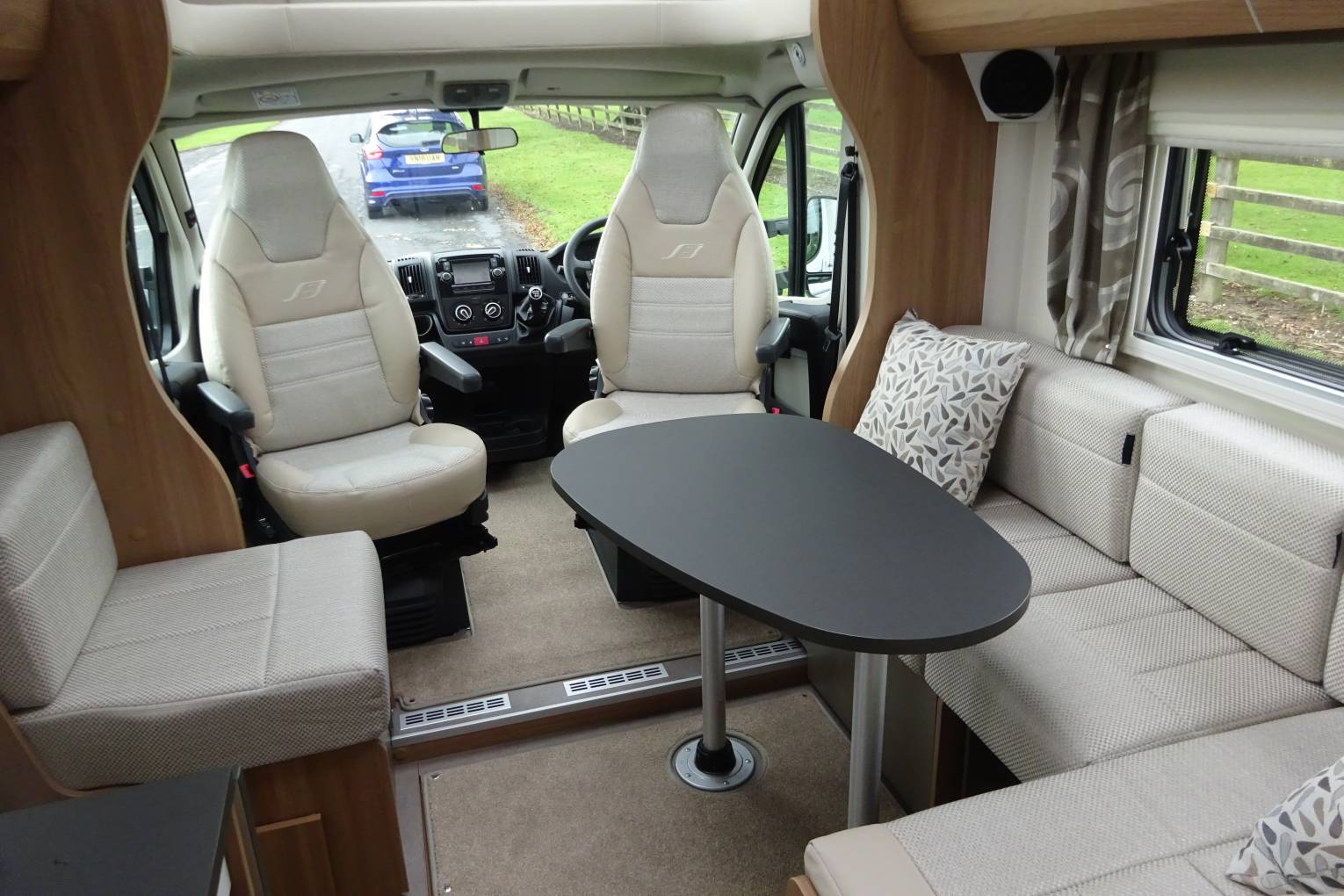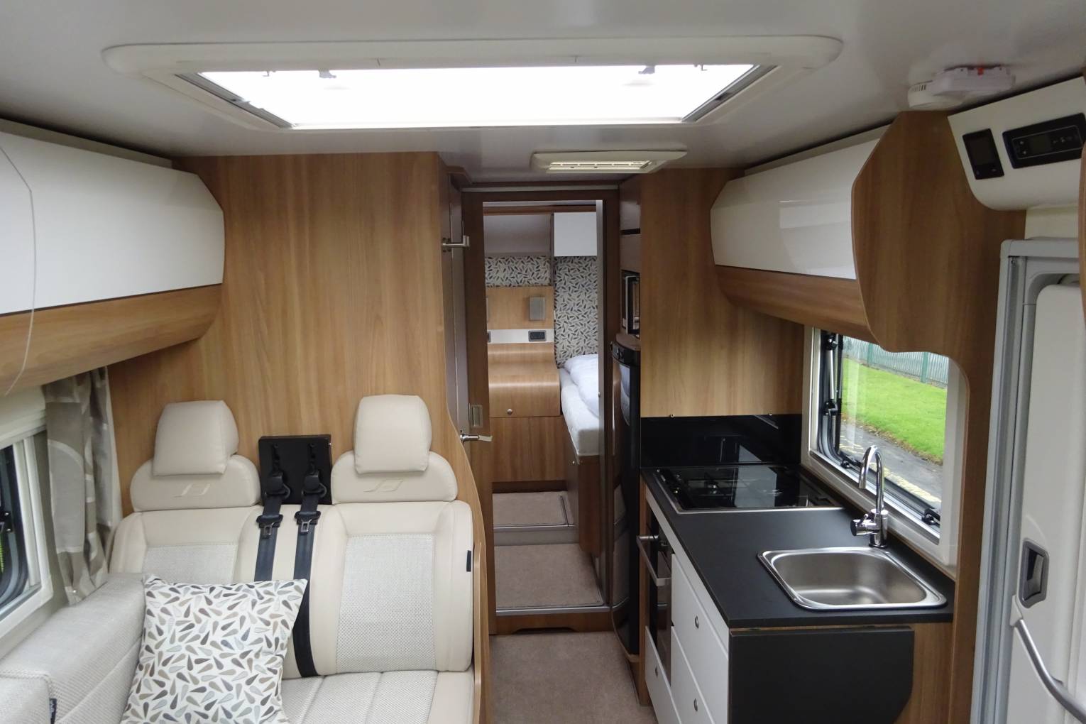 As you step in to the motorhome you are presented with a beautiful seating area which benefits from two captains chairs and a larger table with seating for 6 comfortably. The seating area easily makes up in to a small double bed ideal for the kids or grandkids, with two fixed full size single beds to the rear of the motorhome. The bedroom is fitted with two wardrobes aswell as draws and cupboards beneath the beds, there really is plenty of storage.