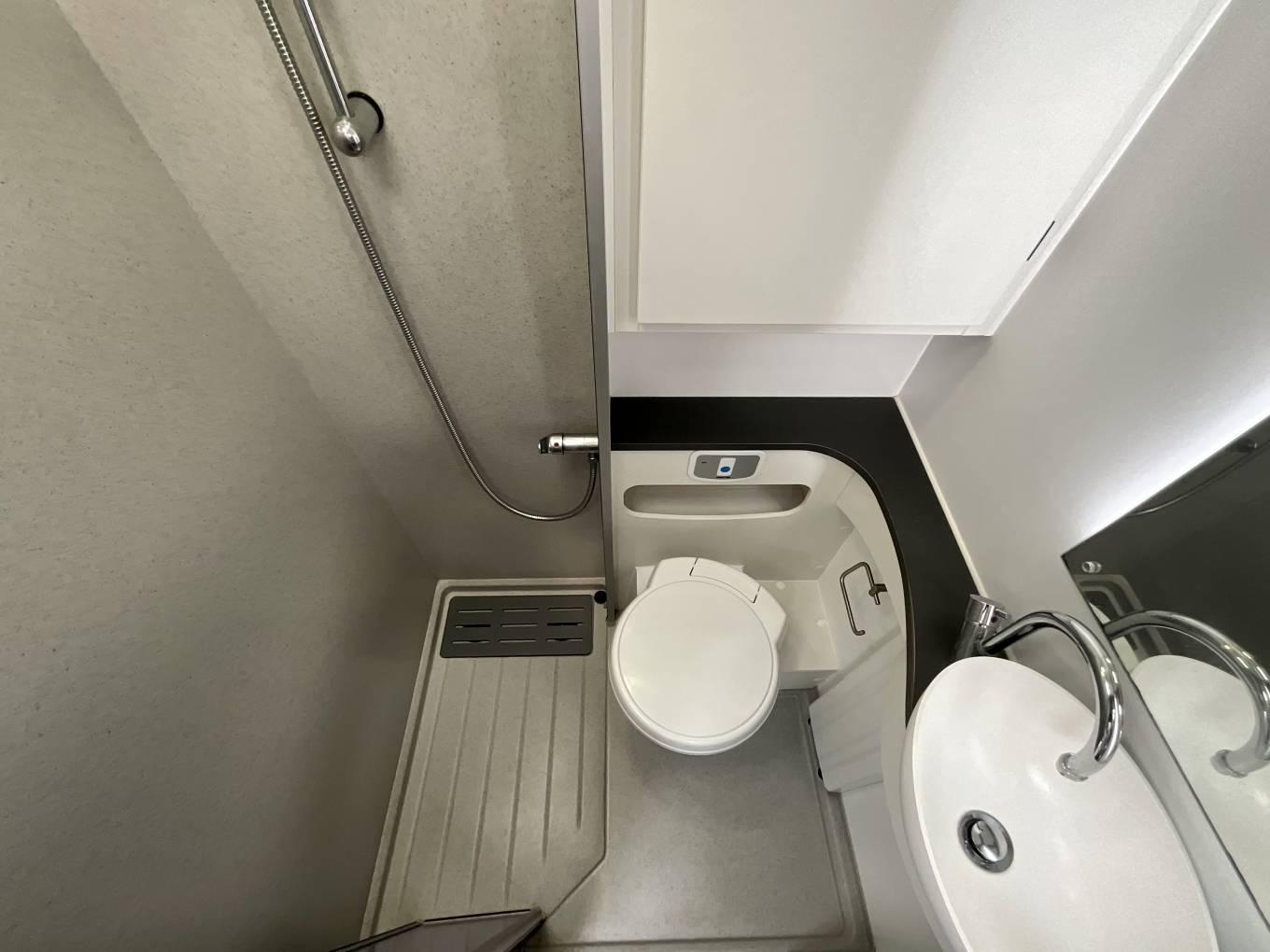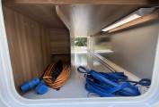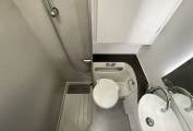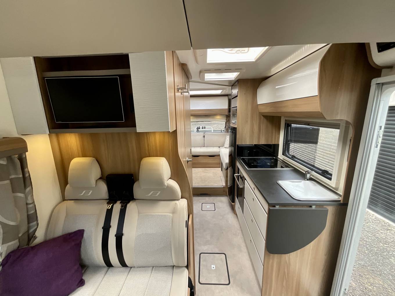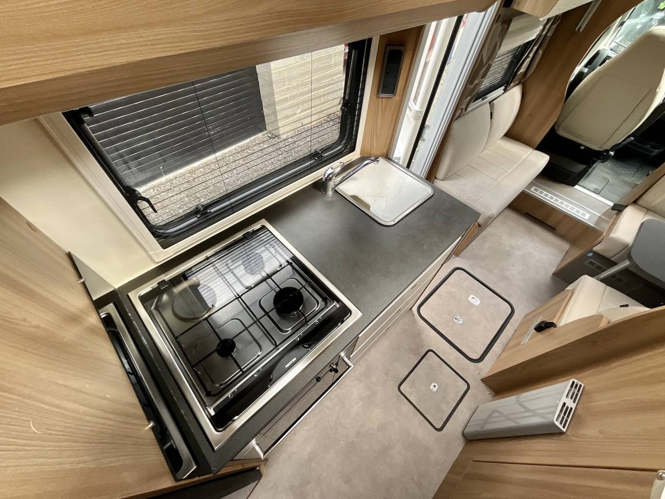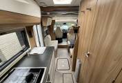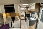Half leather completes the front lounge, with the dinette’s four, fully-belted, crash-tested travel places make up the essential total of six, complete with USB points and three pin sockets. A 12-volt TV features in this motorhome. At night, the pull down bed easily slides into place. Alde heating is present throughout the motorhome, warming up both the water and the living area with ease.