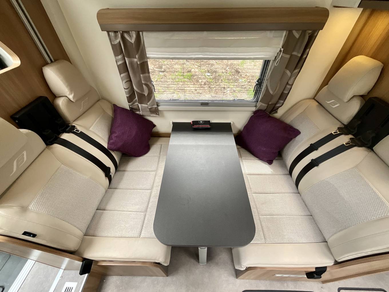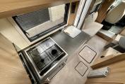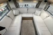The kitchen is fully equipped with a spacious Dometic fridge/freezer, microwave, oven & grill, gas and electric hobs, sink and fold out preparation space for more room. Storage is abundant with plenty of room for crockery, condiments and cutlery.