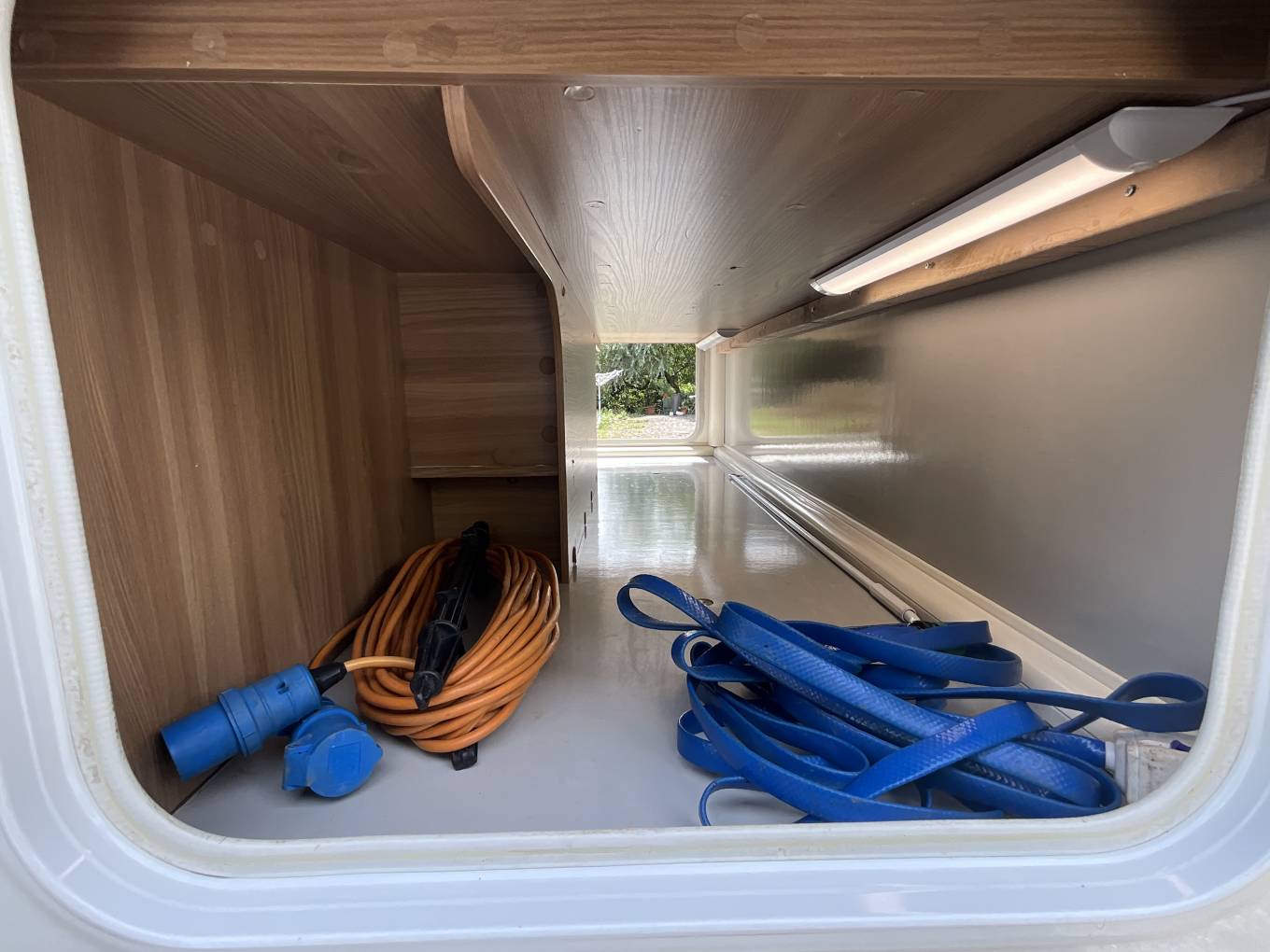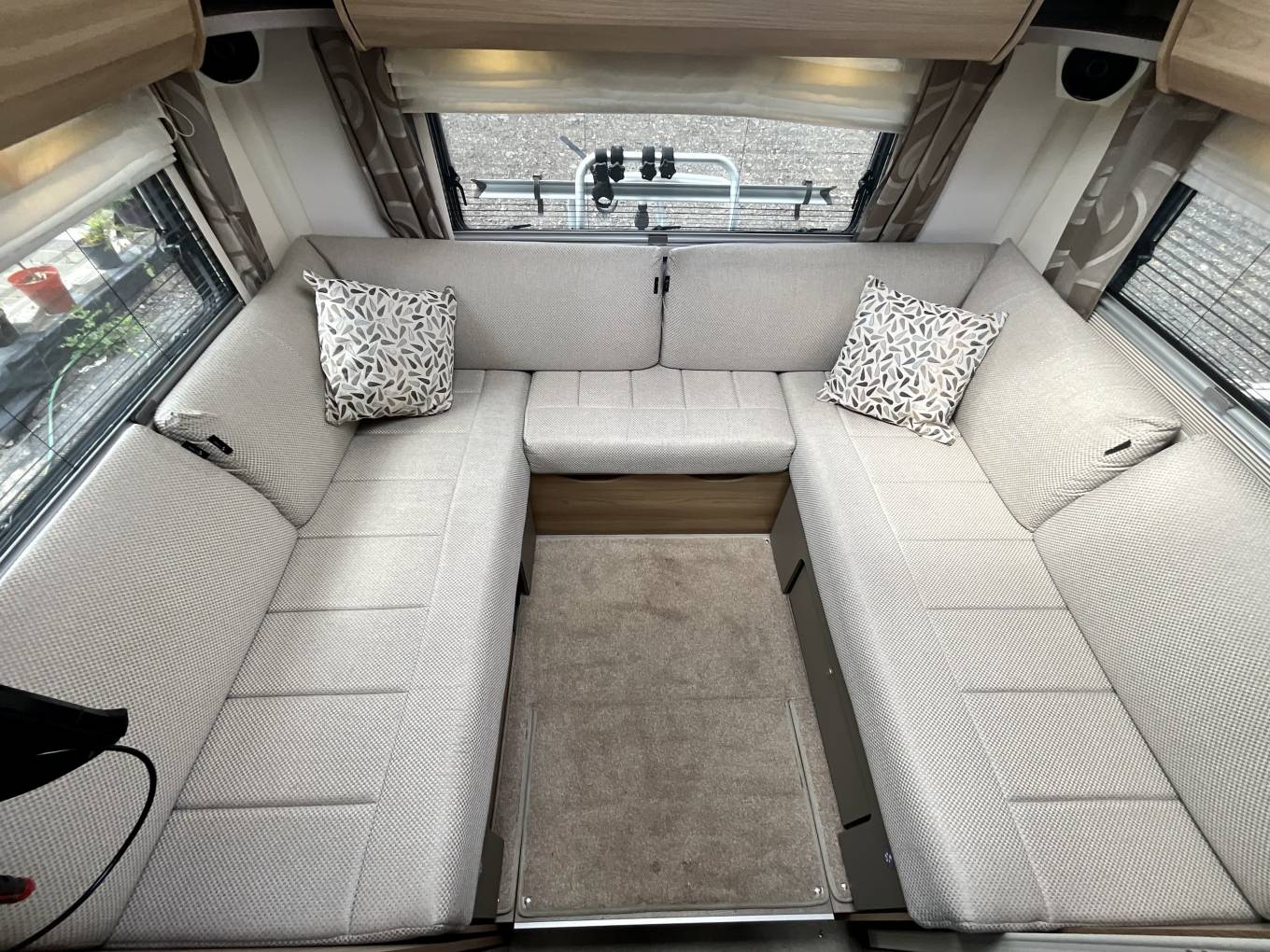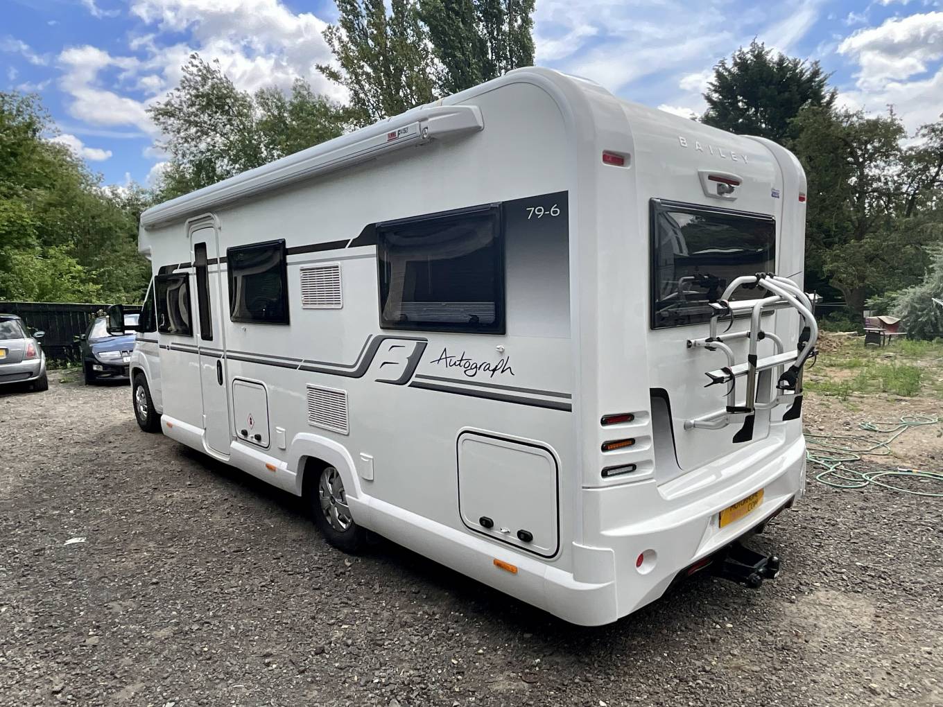 Outside, a full sized Fiamma awning provides plenty of cover. A BBQ point features, along with external 12v and three pin sockets. For storage, a sizeable garage section sits at the back extending across the width of the Bailey. Bike rack is included, and a tow bar, perfect for A-frames or towing a car behind.