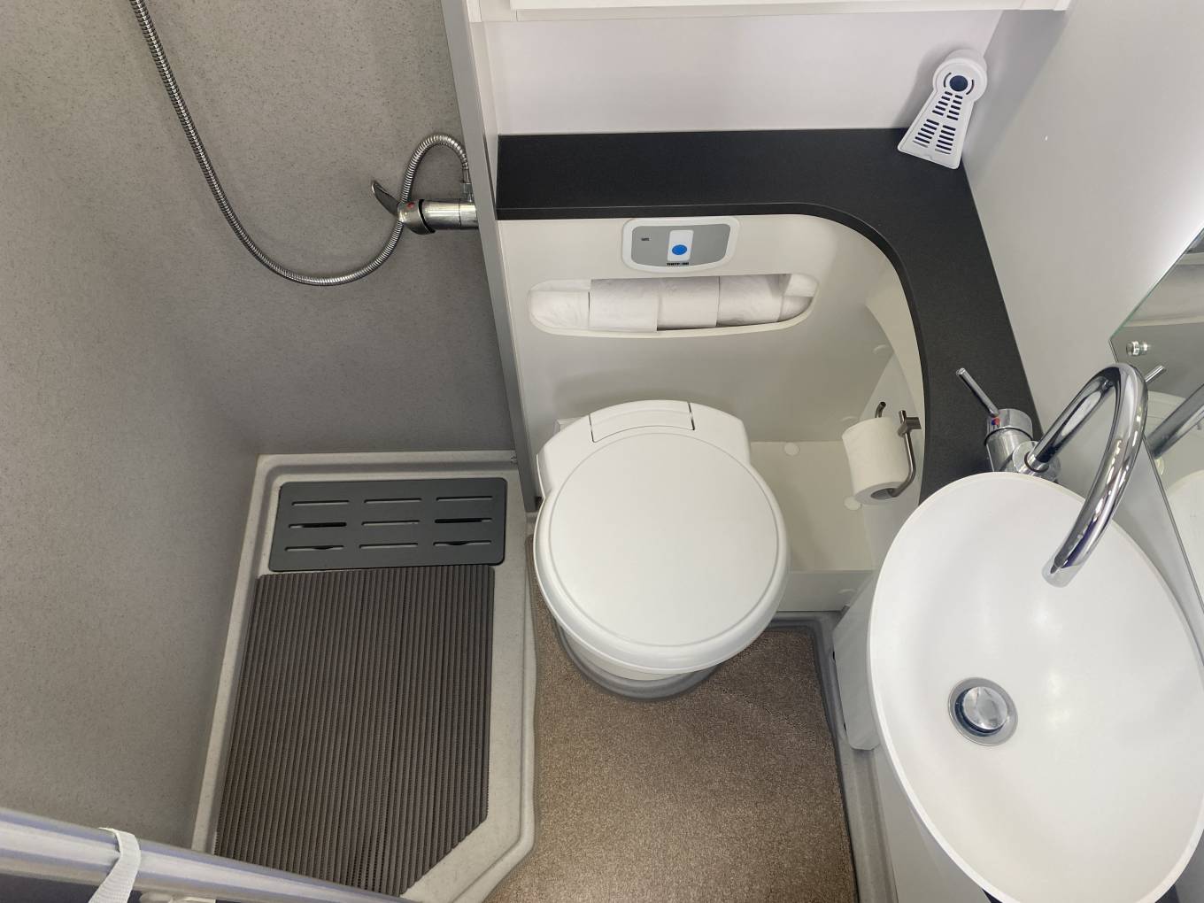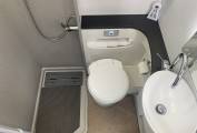 As we move through the motorhome, you have the popular large washroom which consists of a shower, Toilet, washbasin and storage cupboards and shelves with a good sized mirror.