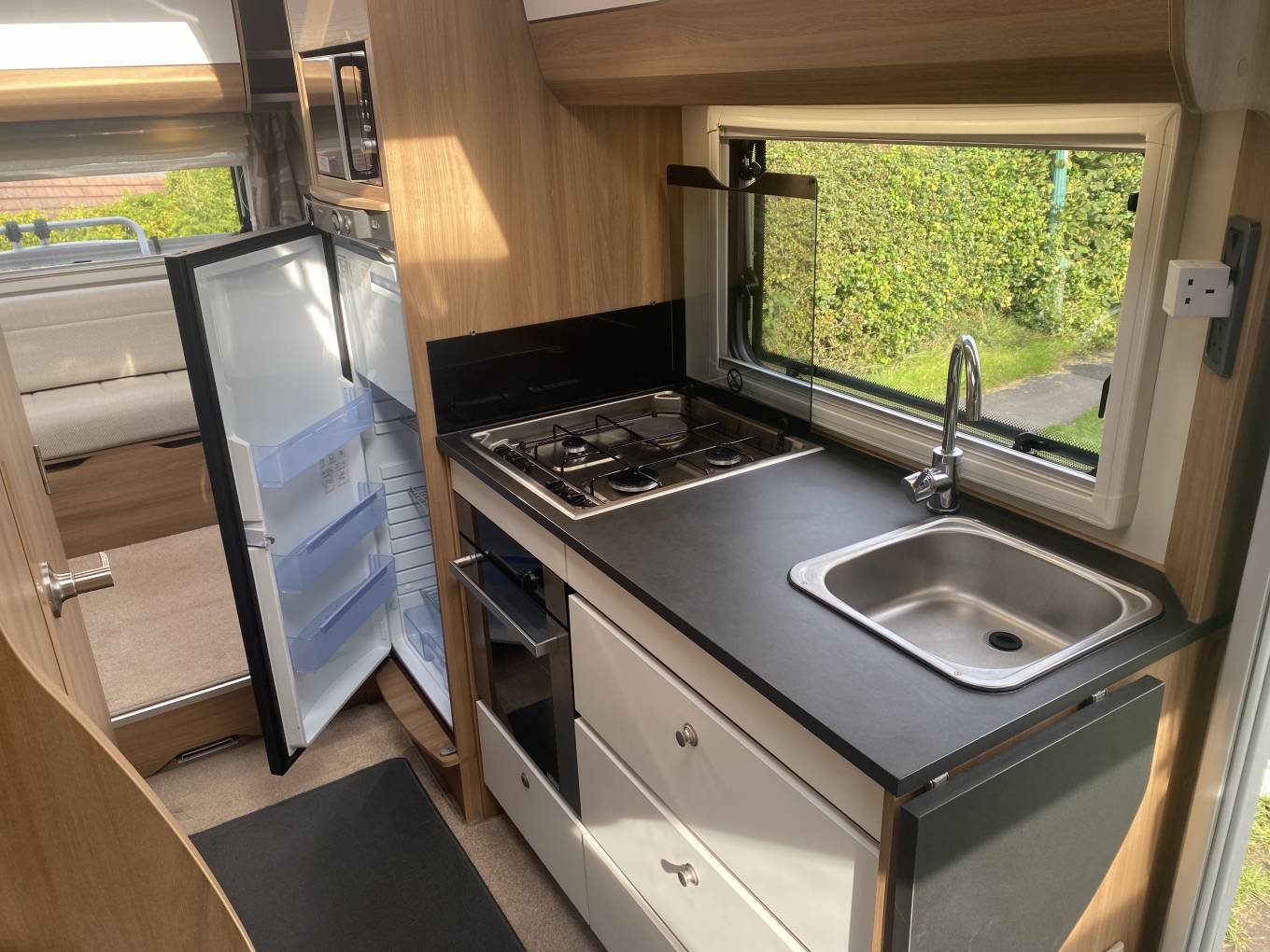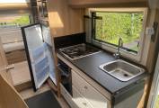 Carrying on through, you come to the kitchen which has everything you need to rustle up a lovely meal. There is a 3 gas ring burner hob, a Thetford Triplex oven with grill, a large Dometic 3 way fridge freezer, a sink with mixer tap, a microwave and lots of storage space for utensils and ingredients plus a good work top area.