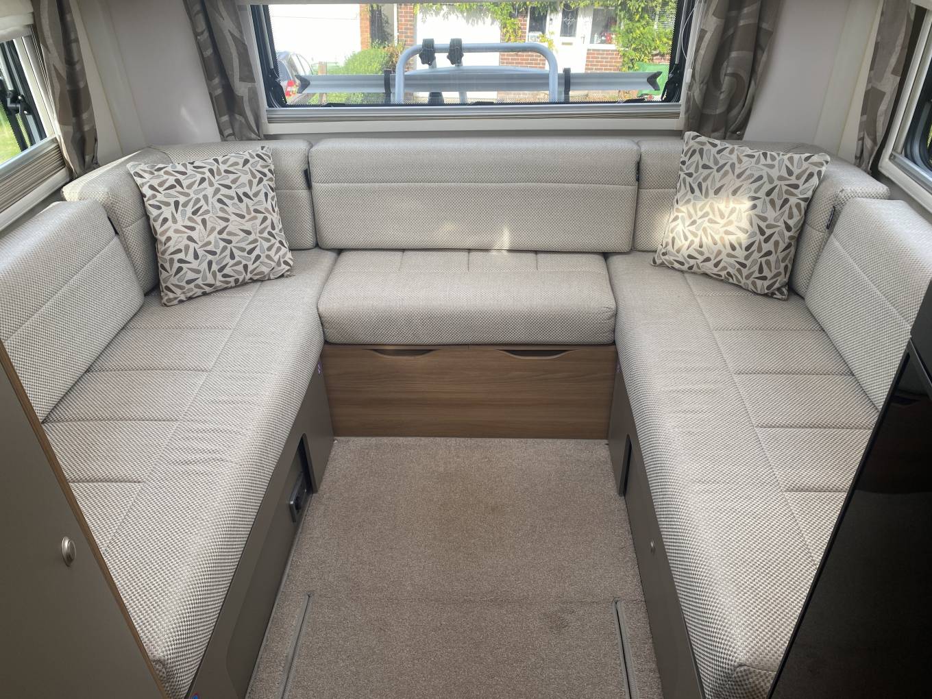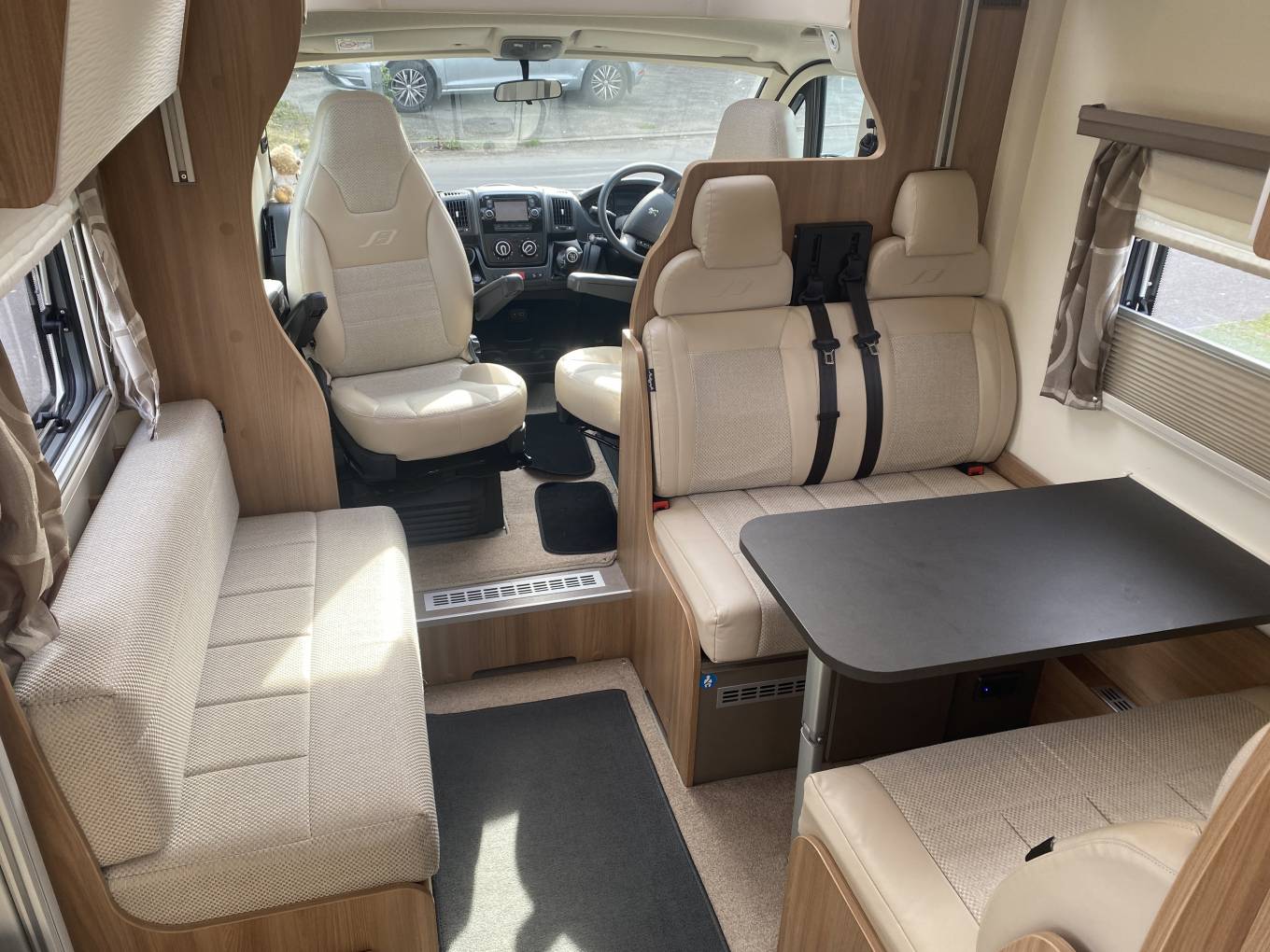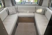 Opposite the kitchen is incredibly spacious central dinette and is flooded with light making it a fabulous spot to relax and unwind in. There is a forward facing 2 seater sofa with 2 seat belts and a rear facing 2 seater sofa fitted with a further 2 seatbelts along with a large dining table in between. Above this area is the large pull down double bed with plenty of room for 2 tall adults.