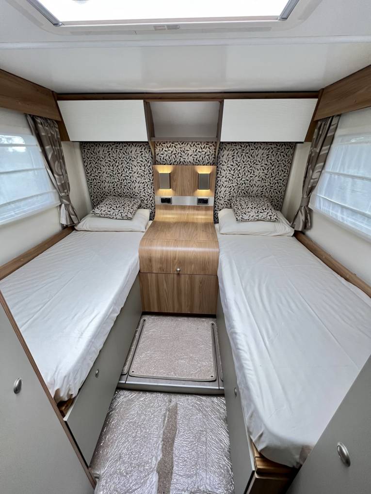 with fixed single beds. A nearside kitchen comes fully equipped with; 3-gas