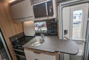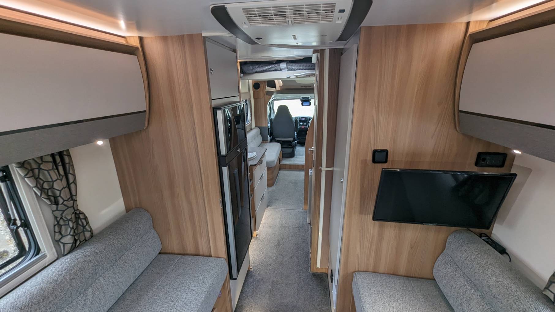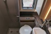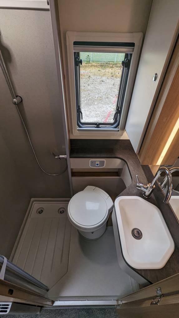 Enjoy the ambiance created by interior mood lighting, adding a touch of coziness. The large washroom includes a cassette toilet, sink with a mixer tap, and ample storage. Additionally, benefit from the convenience of a large fridge freezer and the practicality of a spare wheel.