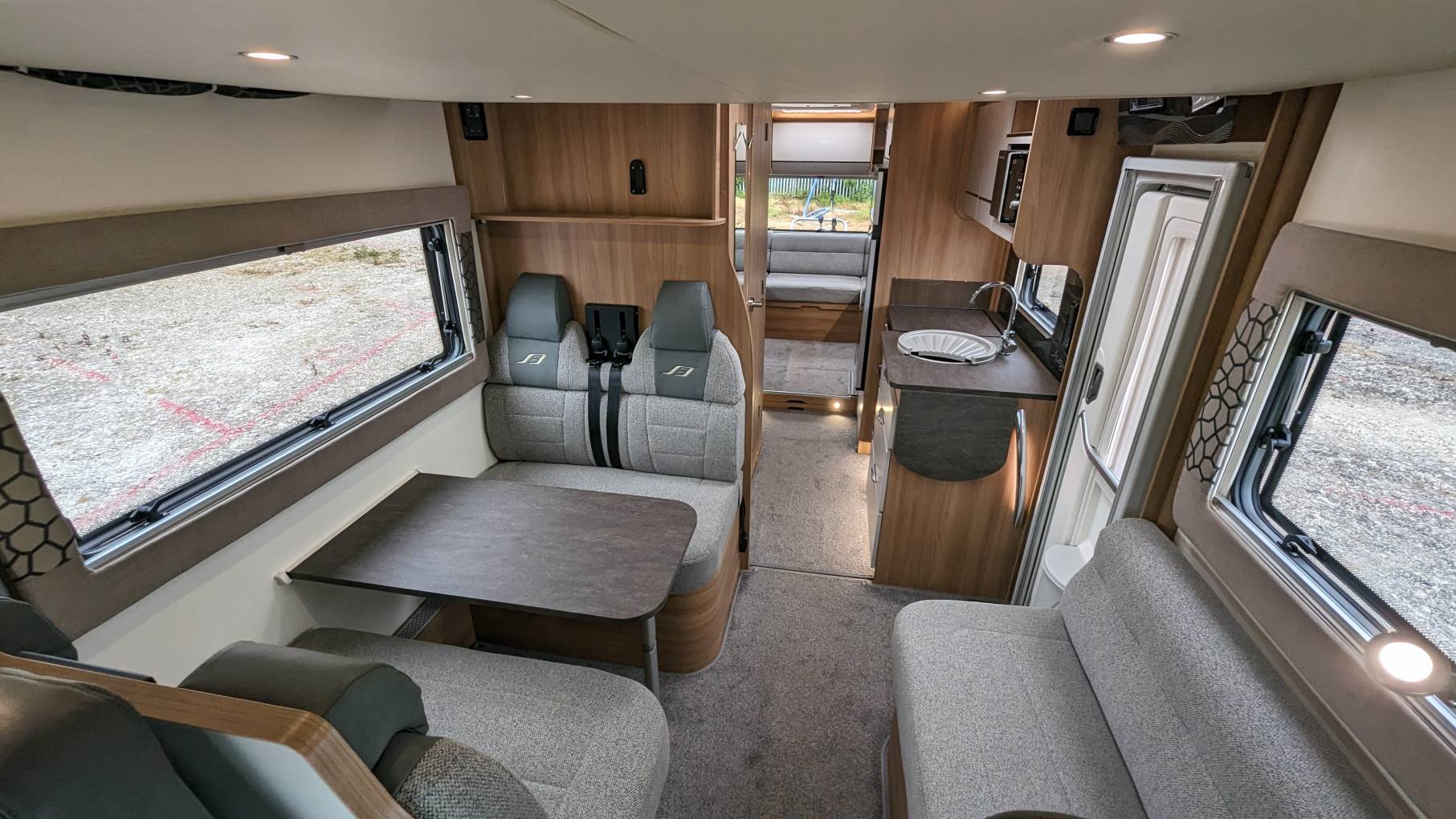 The motorhome features a spacious living area with a center dinette, perfect for entertaining. Prepare delicious meals with the 3 gas ring burner, electric hob, oven, and grill.