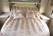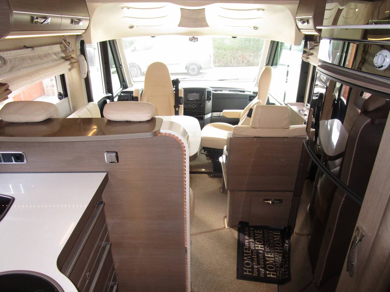 To the rear of the vehicle is the spacious bedroom area with Electric Island bed which is situated above the large garage. Throughout the motorhome there is plenty of storage and lighting which along with the soft cream leather upholstery and quality wood finish provides a feeling of light and space.