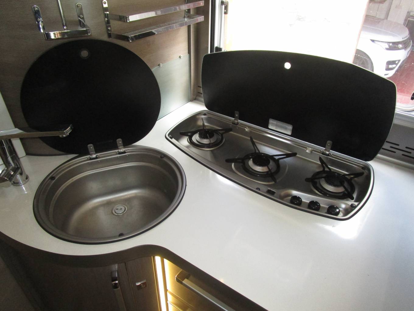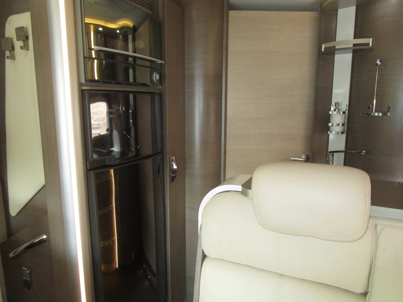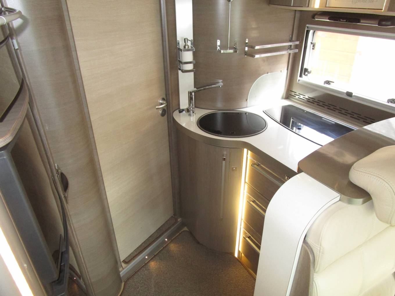 Both the Kitchen and Washroom are located to the centre of the motorhome with the kitchen consisting of 3 burner gas hob with extractor fan, sink, separate fridge and freezer and combined oven and grill. There is ample storage throughout. The motorhome offers a separate shower unit with Alde radiator and the washroom is spacious with washbasin vanity unit and Thetford cassette toilet. Both the Kitchen and Washroom are finished to very high standards.