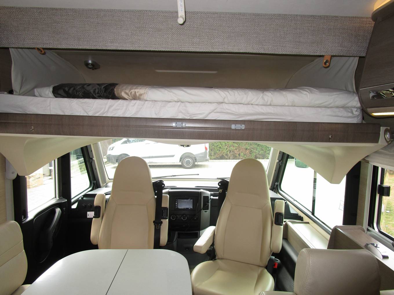 To the front of the vehicle is the L-shaped dining area with two forward facing seats with two 3-point seatbelts and a further single seat also with a 3-point seat belt. With the adjustable table, two captain seats and a cleverly concealed TV makes a perfect dining and relaxing area. Above the cab is the spacious pull down double bed.