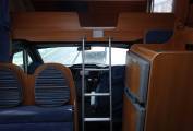 Behind the cab is a dinette area with two forward facing and two rear facing seats with belts. This area also turns into a large double bed.