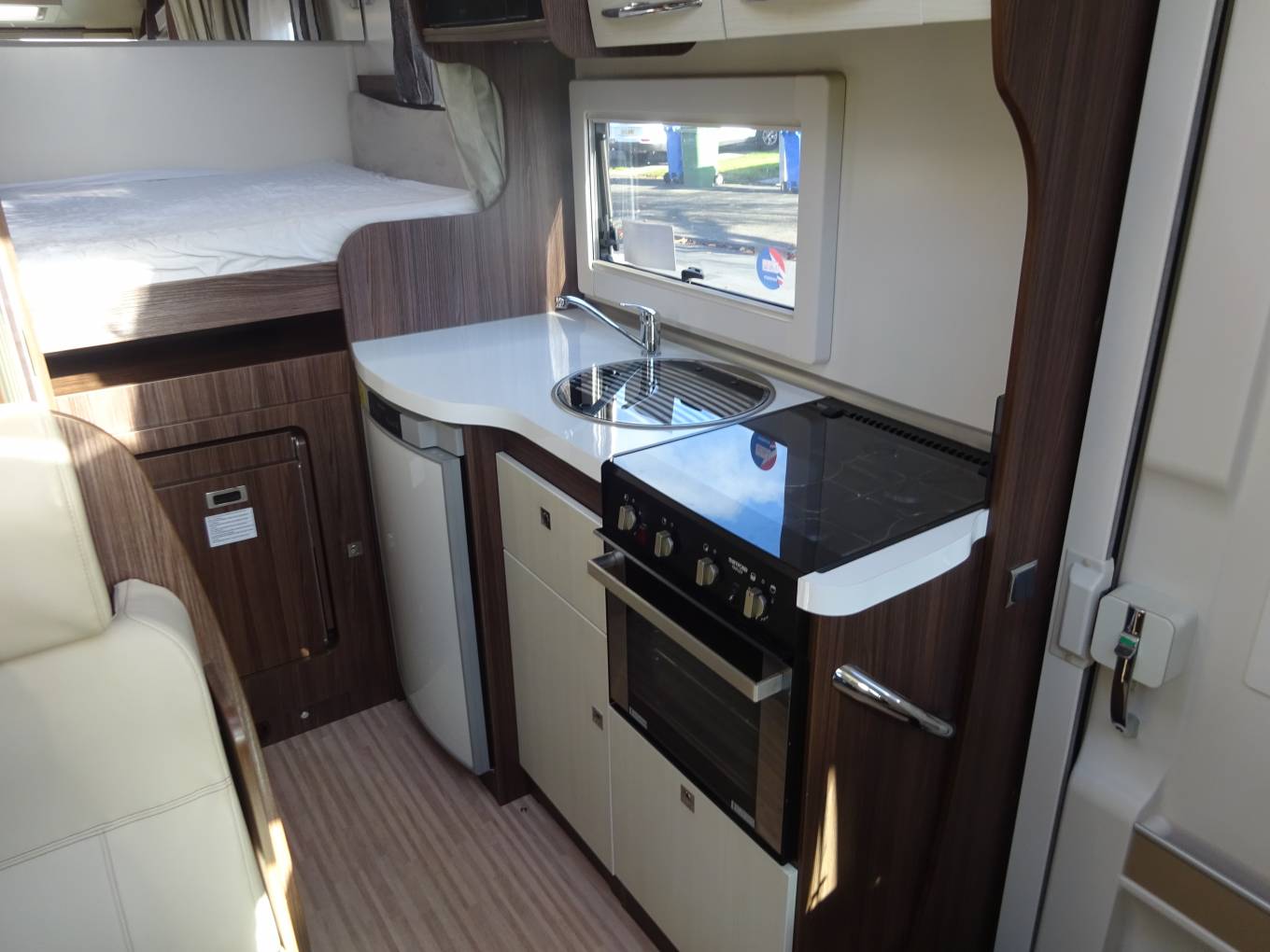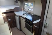 In the centre of the vehicle there's a really generous kitchen specification featuring Duel Fuel Hob, Oven and Grill, Fitted Microwave and a 90 Litre 3 way Dometic Fridge Freezer