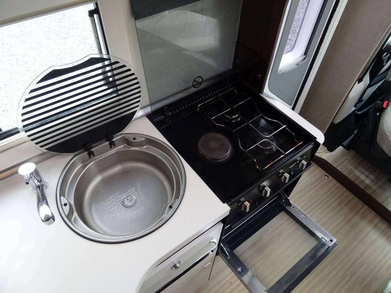 including oven and grill with 3 burner hob and a central dinette. The two gas bottles that come with this motorhome are both refillable and form part of the efficient Gas Flo System.