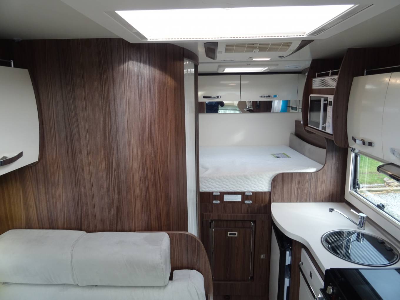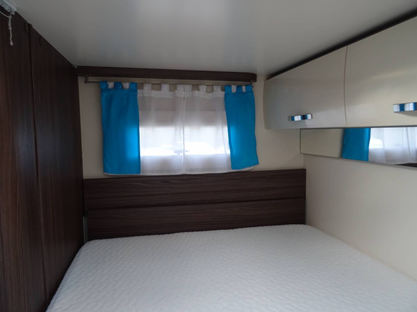 motorhome features a luxurious fixed transverse bed with a custom-made memory