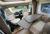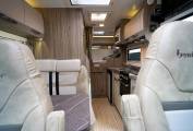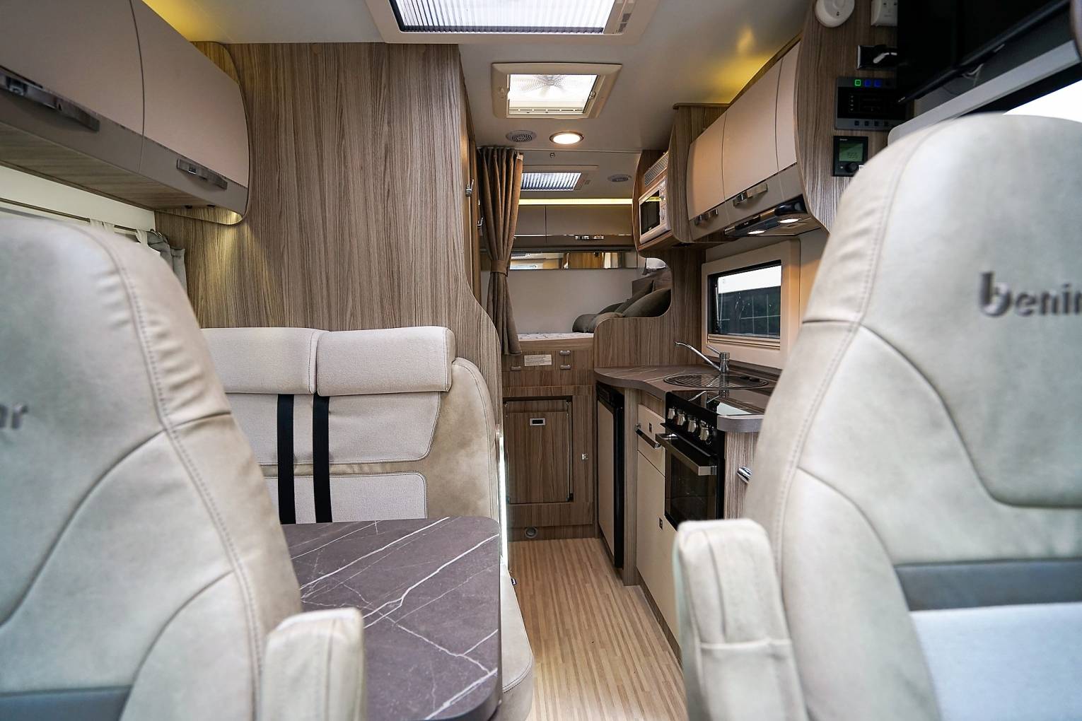 The 201 layout consists of a Front Lounge with foward facing sofa with 2 rear three point seat belts and an extending dining table. Twin Captains swivel seats that