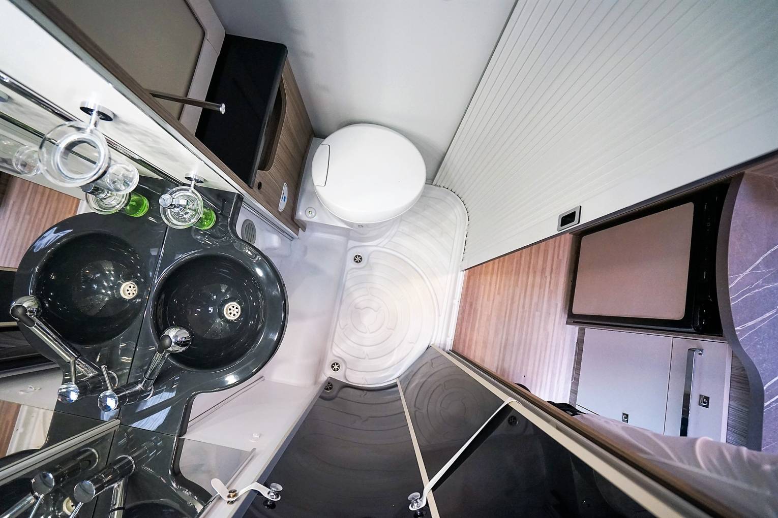 washroom with a Separate shower room, cassette toilet and wash basin. A central