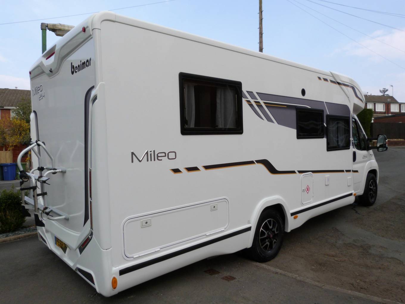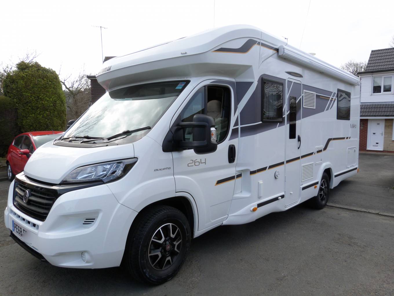 Call with any questions 01423 609985. This 2018 Benimar Mileo 264, low profile, low mileage, coachbuilt motorhome is in pristine condition inside and outside. It is ideal for couples, even though it is 4 berth, with 2 single beds at the rear above the garage which opens on both sides, shower with enclosure, toilet and sink, kitchen, electronic drop-down bed over the forward-facing dinette with 4 seatbelts overall. This distinctive motorhome, is built on a Fiat Ducato chassis, is approx. 7.3 metres long, has a 2300cc, 150bhp diesel engine matched to a 6-speed manual transmission, which powers up the hills, sits on the motorway using cruise control and has covered only 6842 miles. You will need a C1 licence, given the overall permissible weight is 3,650kg. Every inch of it, is clean, tidy and in the best condition it could be. The single beds are at a normal bed height, so easy to get in and out of , with no steps to climb and there is plenty of storage above and below the beds. The toilet and sink are on the nearside and opposite the separate shower enclosure. A privacy door separates this area from the habitation area further forward. The kitchen is well equipped with a cooker that has oven, grill, 2 gas burners, 1 electric hob; large Dometic fridge with freezer and has useful food preparation area between the cooker and sink. The front dinette is extensive and light, with large windows allowing plenty of natural light to enter. There are 2 forward facing seats and 2 seatbelts and opposite a small sofa. The multi-position table can be used for entertaining and moves in all directions and can be opened in 2 positions. Above is the electronic drop down double bed. Up front, there is cab air conditioning, cruise control, 2 x swivel seats, sunroof, 2 reading lights and Remis blinds. Additional features include, gas BBQ point, TV and 12v sockets in the garage, Teletrac Tracker system, plus Fiat Connect multimedia centre including Bluetooth, sat nav and rear-view camera, canopy, and solar panel. The MOT runs until September 2022 and the extra pictures show off all its features. Viewing by appointment only near Accrington, Lancashire. Part Exchanges welcomed on this vehicle, for further information and photos please call us on 01423 609985 quoting reference 179985