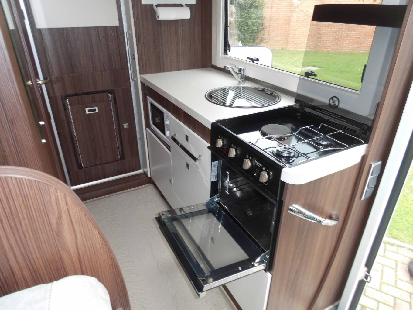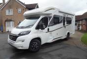 As you enter the motorhome the well appointed kitchen is on your right. It features a dual-fuel hob with an electric hotplate and 2 gas burners, a gas oven and grill, a full size 141 litre Thetford fridge freezer, a sink with mixer tap, a microwave and lots of cupboard and drawer storage space including a pull out sliding pantry cabinet so you have all the facilities that you need to rustle up a lovely meal. At the rear of the motorhome there is a large wardrobe and below this is a door giving you internal access to the garage. On the opposite side at the rear is the gorgeous bathroom which has a large separate shower with a screen, an electric flush toilet, a wash basin with mixer tap, a mirrored cabinet and a wardrobe. A large window and a skylight throw in plenty of natural light.