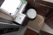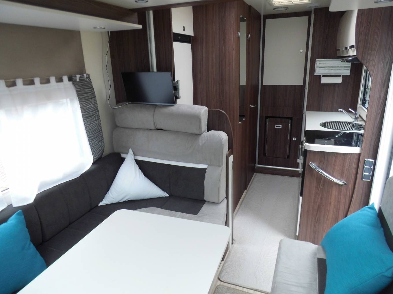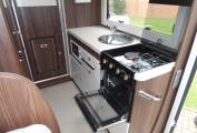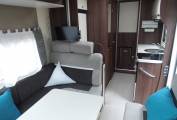 The lounge/dinette comprises of an L shape sofa one side fitted with 2 x 3 point seat belts and a side facing sofa on the opposite side. At night time these convert into a double bed. Above this area stored neatly away flush to the ceiling is an electric drop down double bed which is one of the standout features of this delightful motorhome. Pop up the freestanding dining table, spin both the front seats round and you have comfortable dining or drinks for up to 7 people.