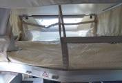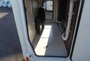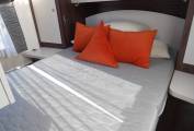 In the bedroom at the rear you have a large skylight throwing in plenty of natural light and there are overhead lockers as well as two wardrobes to store all of your clothing. The island bed is also height adjustable so if you need to get bikes in the garage below you can do this by simply raising the bed to increase the garage height. There is a wall mounted TV to enjoy television in bed and there is a USB charging point for your tablet. If you want a bit of space from the other passengers or children a sliding door comes across to give you complete privacy.