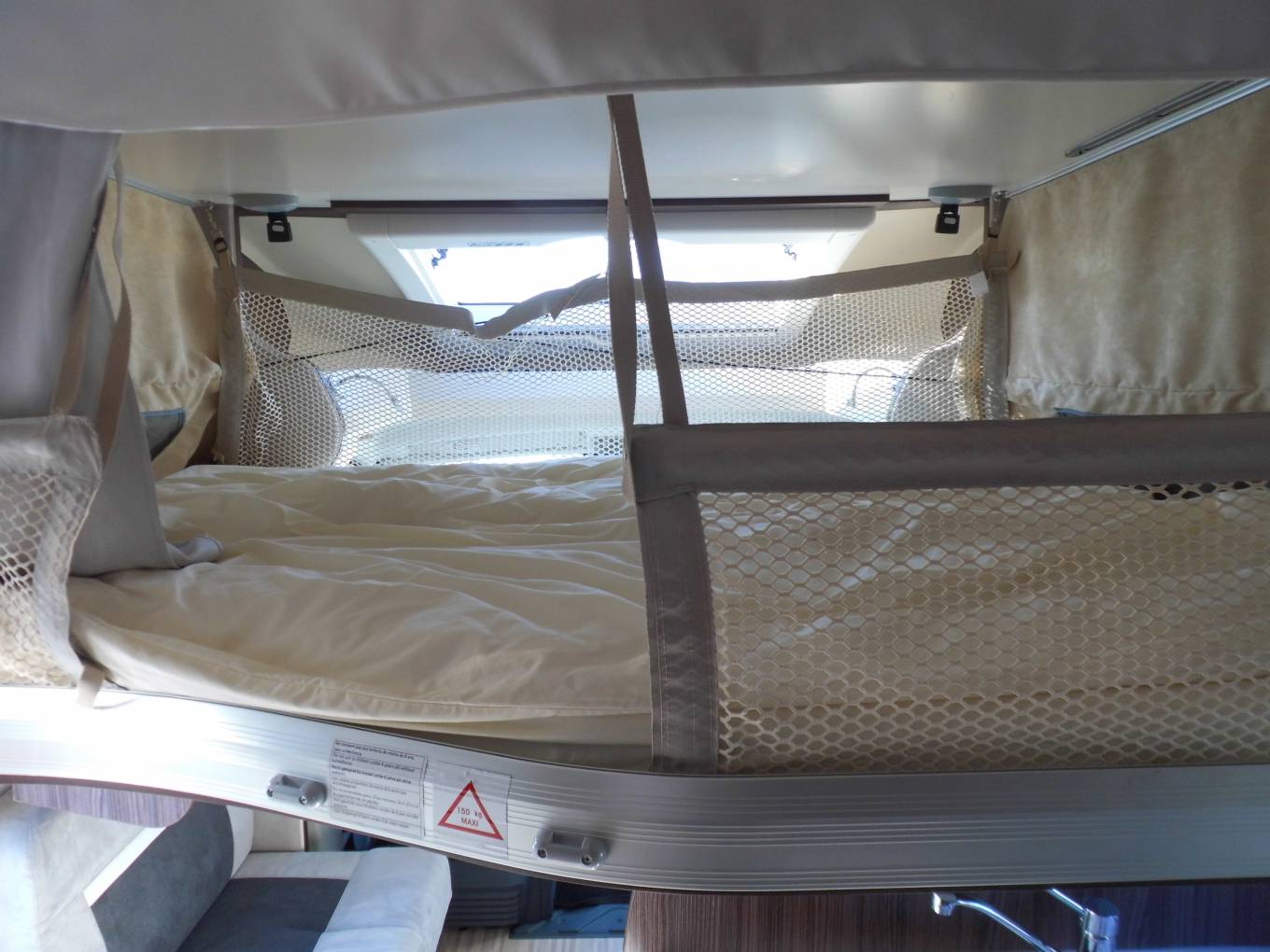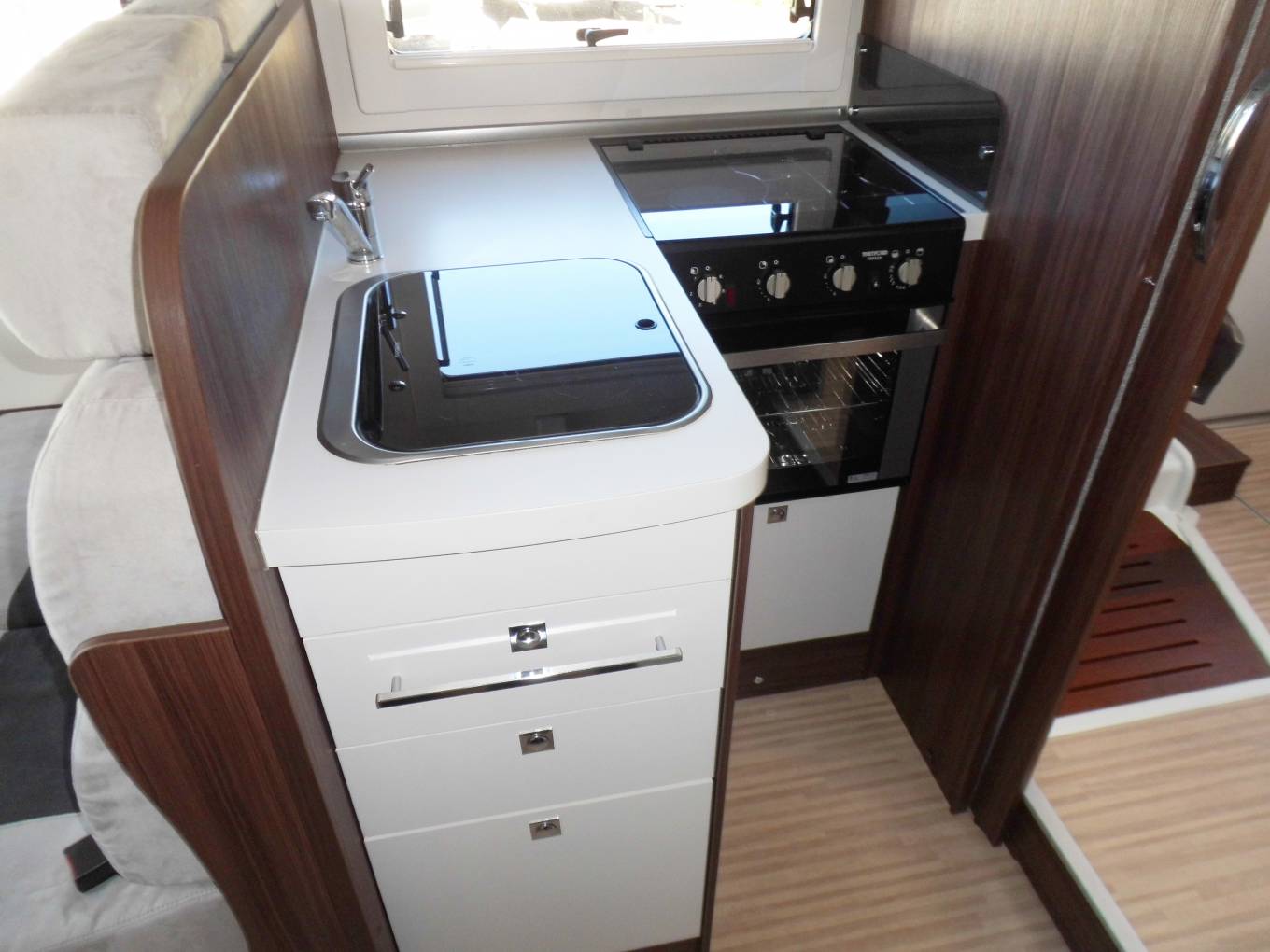 The stand out features on this delightful motorhome are the rear island bed and the drop down bed over the dinette. An island bed is one of the most sought after features with buyers at the moment as it means that if you need to pop to the loo in the early hours you don't have to climb over your partner to get out of bed. Having a drop down bed over the dinette which stores back up into the ceiling when not in use is a real perk and means that neither bed needs to be made up each day.