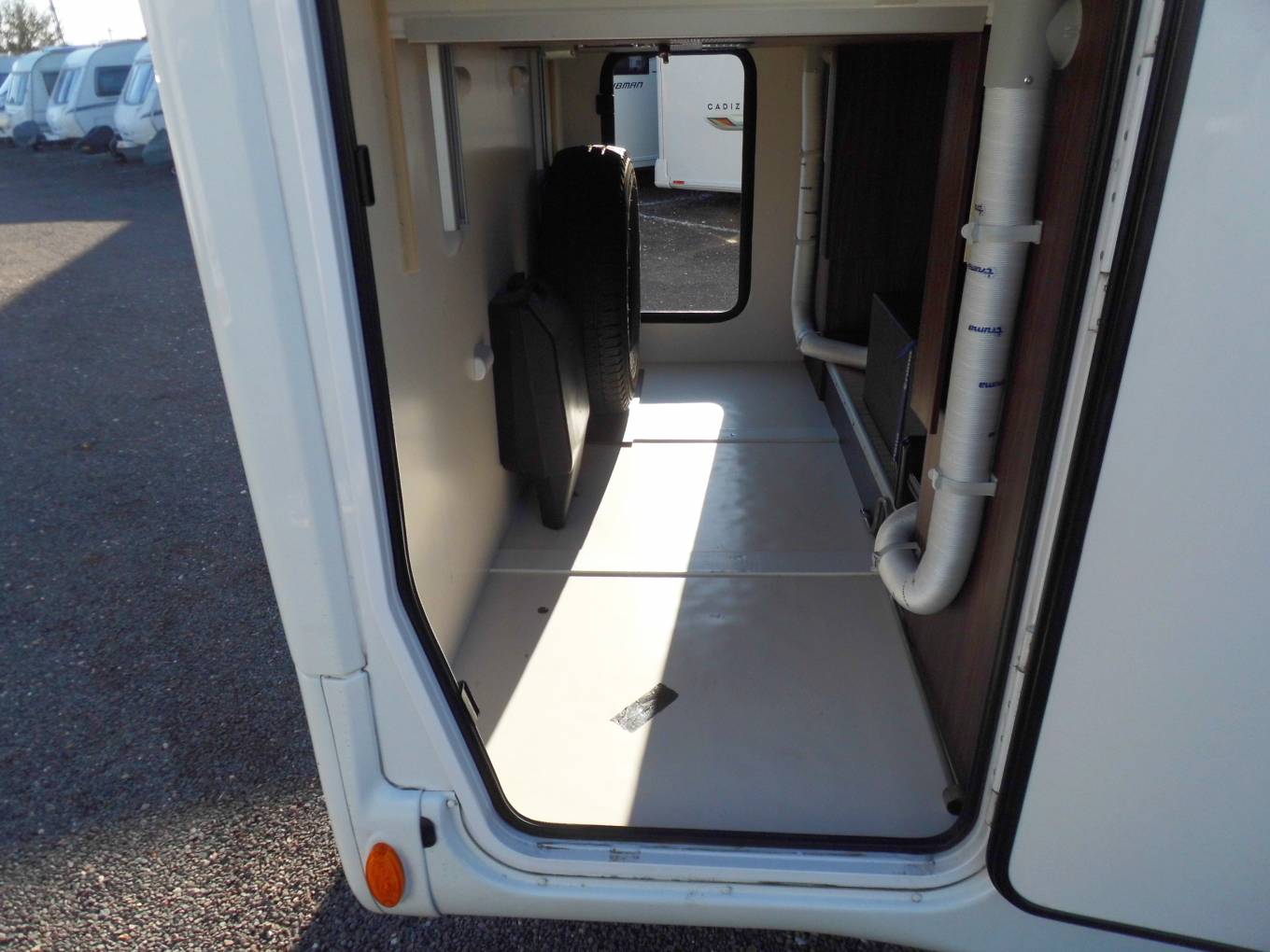 On top of this impressive specification this Benimar has a rear garage which is great for long term trips or holidays, an external BBQ point for al fresco dining, alloy wheels, a spare wheel and very stylish external graphics. The seller is also including an awning, silver screen covers and a hook-up lead. In the garage at a cost of £2500 he has also had an air conditioning unit installed which works by remote control.