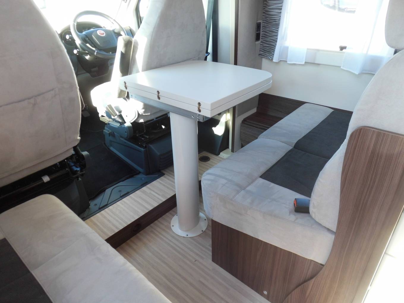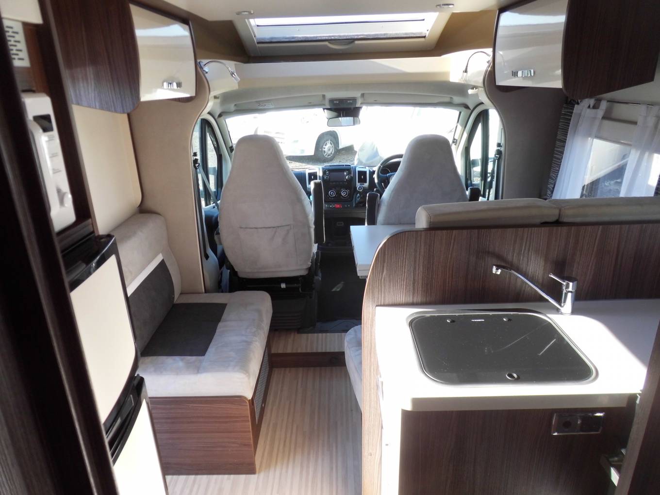Towards the front of the motorhome is the delightful lounge dinette which is a lovely place to relax in after a day out. It features a forward facing two seater sofa fitted with 2 seat belts and there is also a side facing single chair. There is a multi-directional sliding dining table which also extends. Both front seats are swivel seats so these can be rotated to allow extra seating at mealtimes if required. There is yet another large skylight above the dinette which opens for you to enjoy fresh air while you relax and dine.