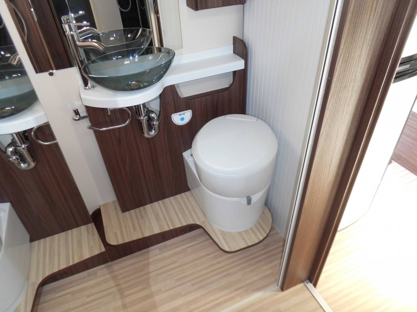 As you exit the bedroom on the left hand side you have a split bathroom with a Thetford cassette toilet with electric flush, a wash basin with mixer tap, a mirror and storage cupboard, and on the right you have a large separate shower with a perspex screen and a skylight, so if you enjoy wild camping you can keep yourself smelling fresh as a daisy.